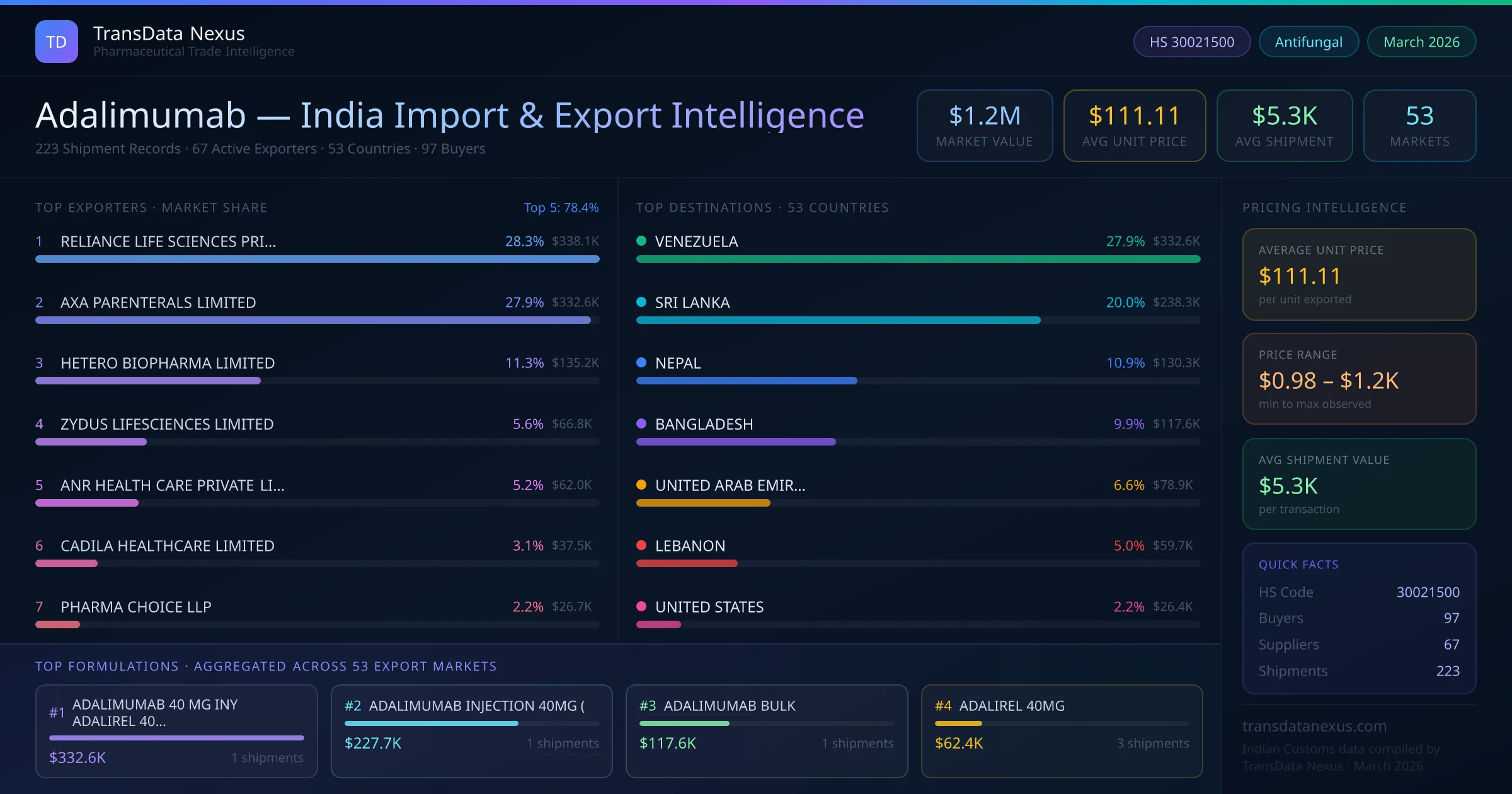 The average unit price for adalimumab exports from India is $111.11 per unit, with prices ranging from $0.98 to $1245.35 depending on formulation and order volume.