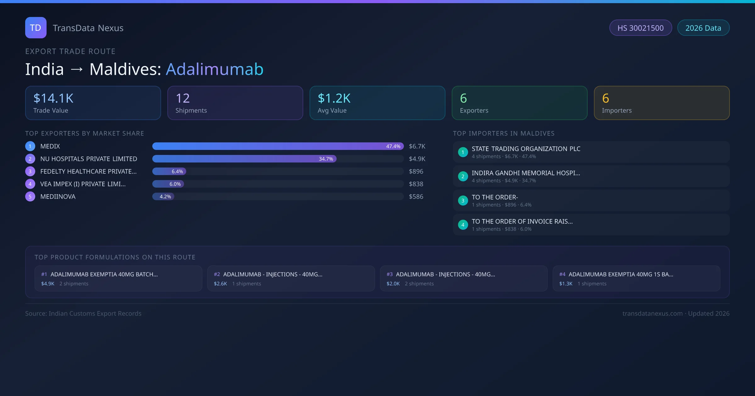- 1.Route Identification: India to Maldives export trade corridor identified from Indian Customs (DGFT) records for Adalimumab.