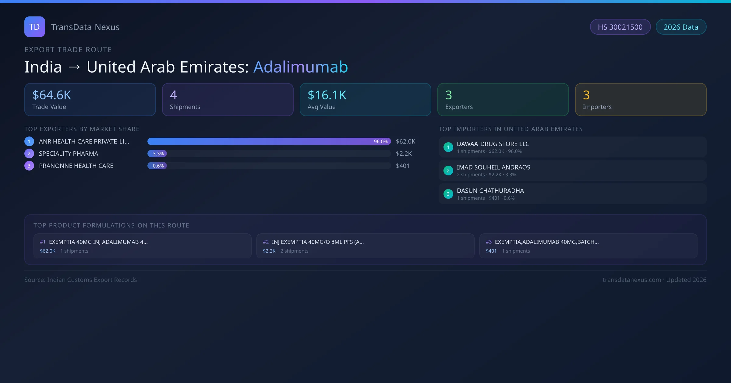 India has recorded 4 verified shipments of Adalimumab exported to United Arab Emirates, representing a combined trade value of $64.6K USD. This corridor is served by 3 active Indian exporters, with an average shipment value of $16.1K USD. The leading Indian exporter is ANR HEALTH CARE PRIVATE LIMITED, which accounts for 96% of total export value with 1 shipments worth $62.0K USD. On the buying side, DAWAA DRUG STORE LLC is the largest importer in United Arab Emirates with $62.0K USD in purchases. The top 3 suppliers β ANR HEALTH CARE PRIVATE LIMITED, SPECIALITY PHARMA, PRANONNE HEALTH CARE β together control of total trade value on this route. All data sourced from Indian Customs (DGFT) shipping bill records. Values reported in FOB USD.