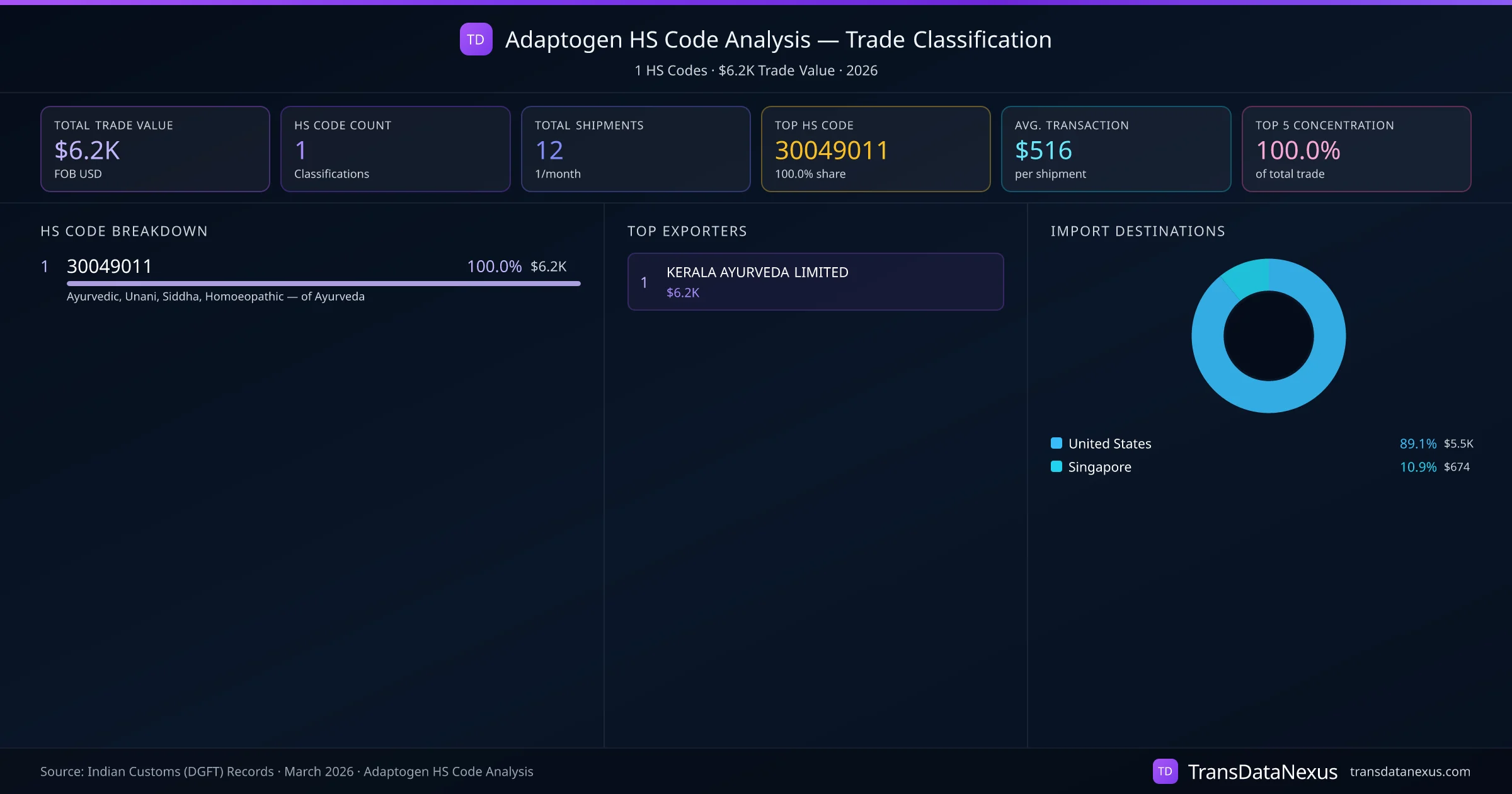 India exports Adaptogen under 1 distinct HS code classifications, representing a total trade value of $6.2K across 12 shipments. The dominant classification is HS 30049011 (Ayurvedic, Unani, Siddha, Homoeopathic โ of Ayurveda), accounting for 100.0% of all Adaptogen trade at $6.2K. The top 5 HS codes together account for 100.0% of total Adaptogen trade from India. The average transaction value is $516. Key importing markets include UNITED STATES, United States, SINGAPORE. Leading exporters include KERALA AYURVEDA LIMITED. Data sourced from Indian Customs (DGFT) shipping bill records.