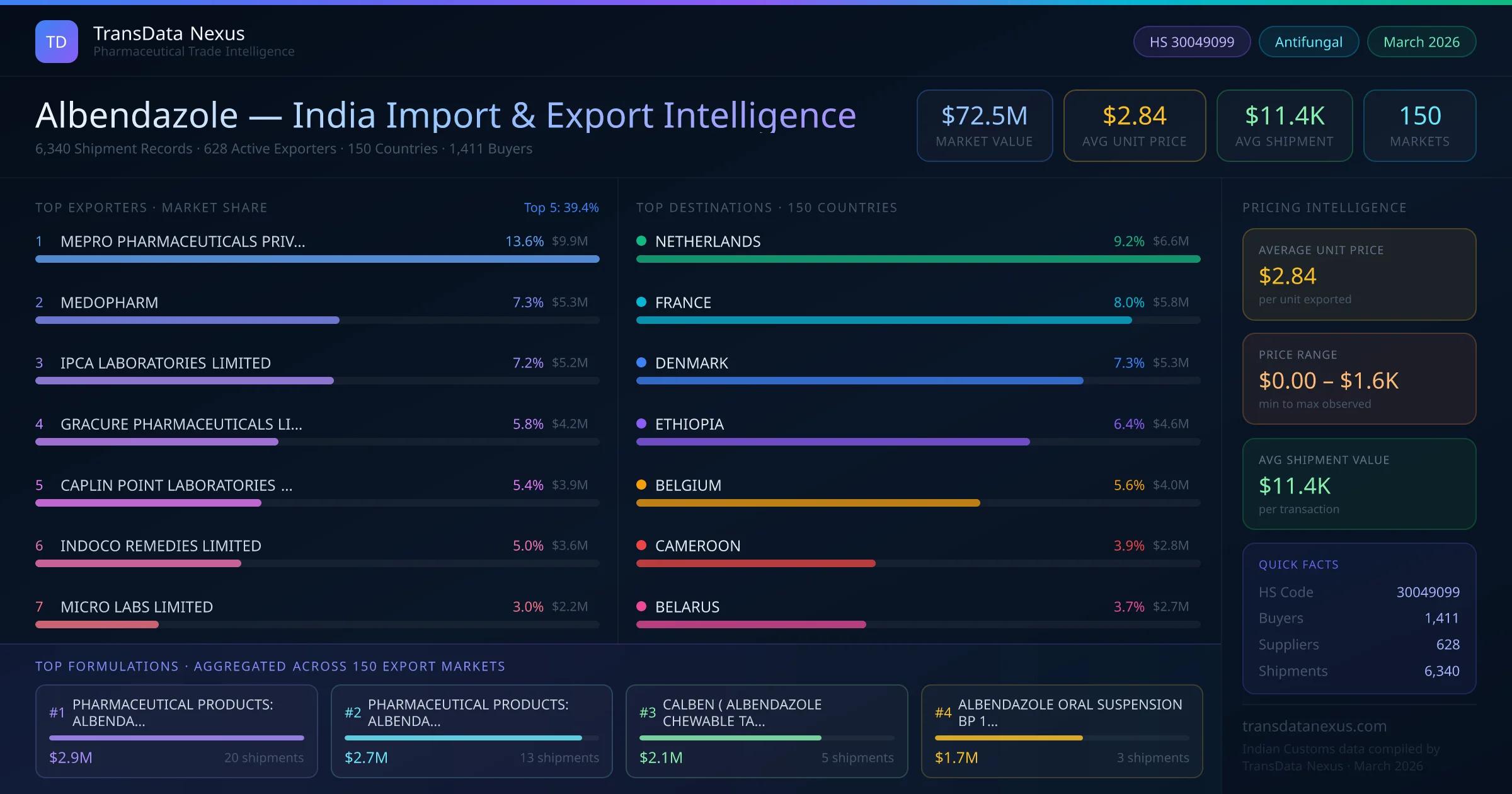 The total export value of albendazole from India is $72.5M, recorded across 6,340 shipments from 628 active exporters to 150 countries. The average shipment value is $11.4K.