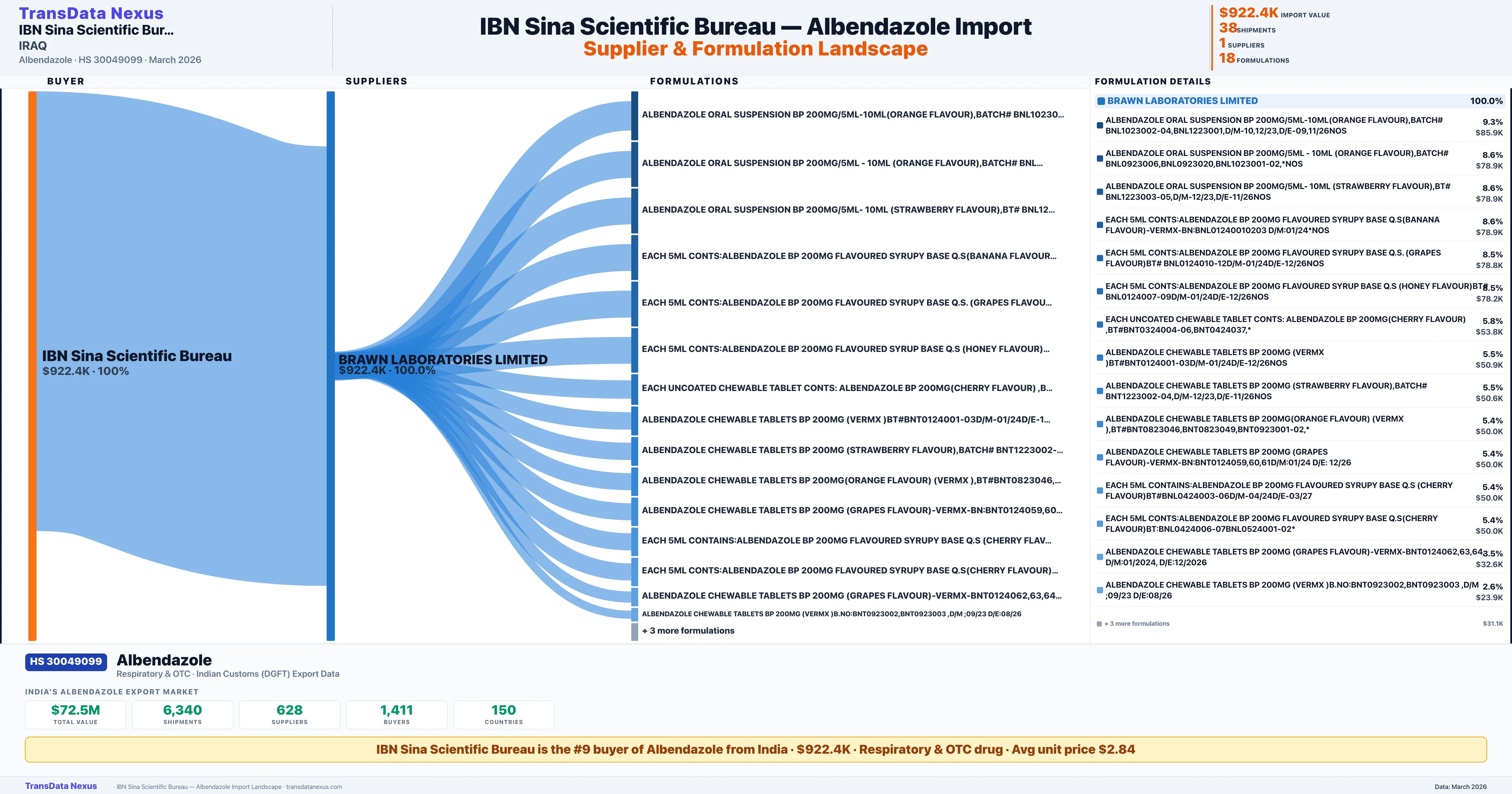 IBN SINA SCIENTIFIC BUREAU sources Albendazole from 1 verified Indian supplier: BRAWN LABORATORIES LIMITED ($922.4K, 100.0%). This is based on 38 customs records.