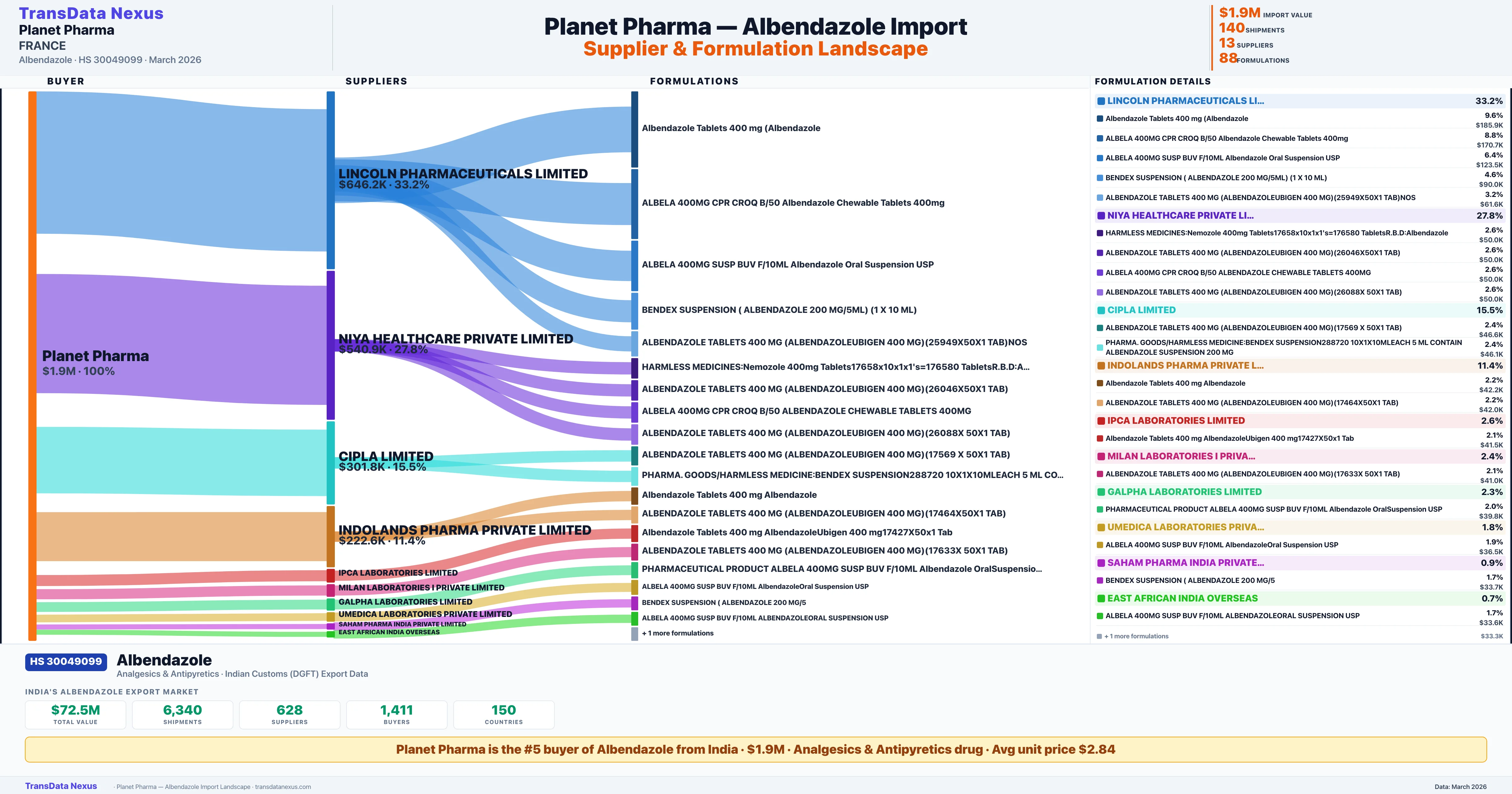 PLANET PHARMA sources Albendazole from 13 verified Indian suppliers: LINCOLN PHARMACEUTICALS LIMITED ($646.2K, 33.2%), NIYA HEALTHCARE PRIVATE LIMITED ($540.9K, 27.8%), CIPLA LIMITED ($301.8K, 15.5%), INDOLANDS PHARMA PRIVATE LIMITED ($222.6K, 11.4%), IPCA LABORATORIES LIMITED ($50.0K, 2.6%). This is based on 140 customs records.