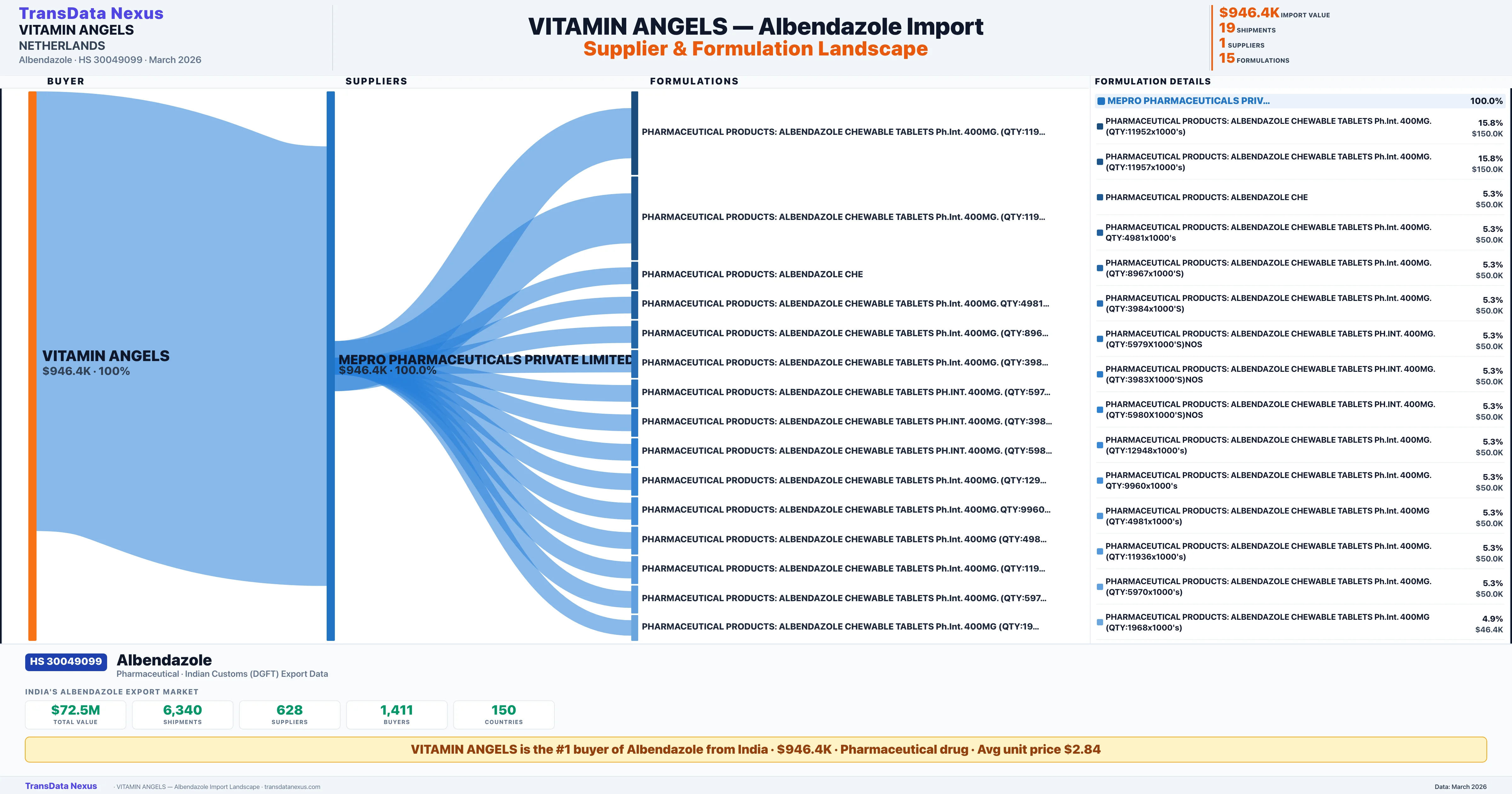 VITAMIN ANGELS sources Albendazole from 1 verified Indian supplier: MEPRO PHARMACEUTICALS PRIVATE LIMITED ($946.4K, 100.0%). This is based on 19 customs records.