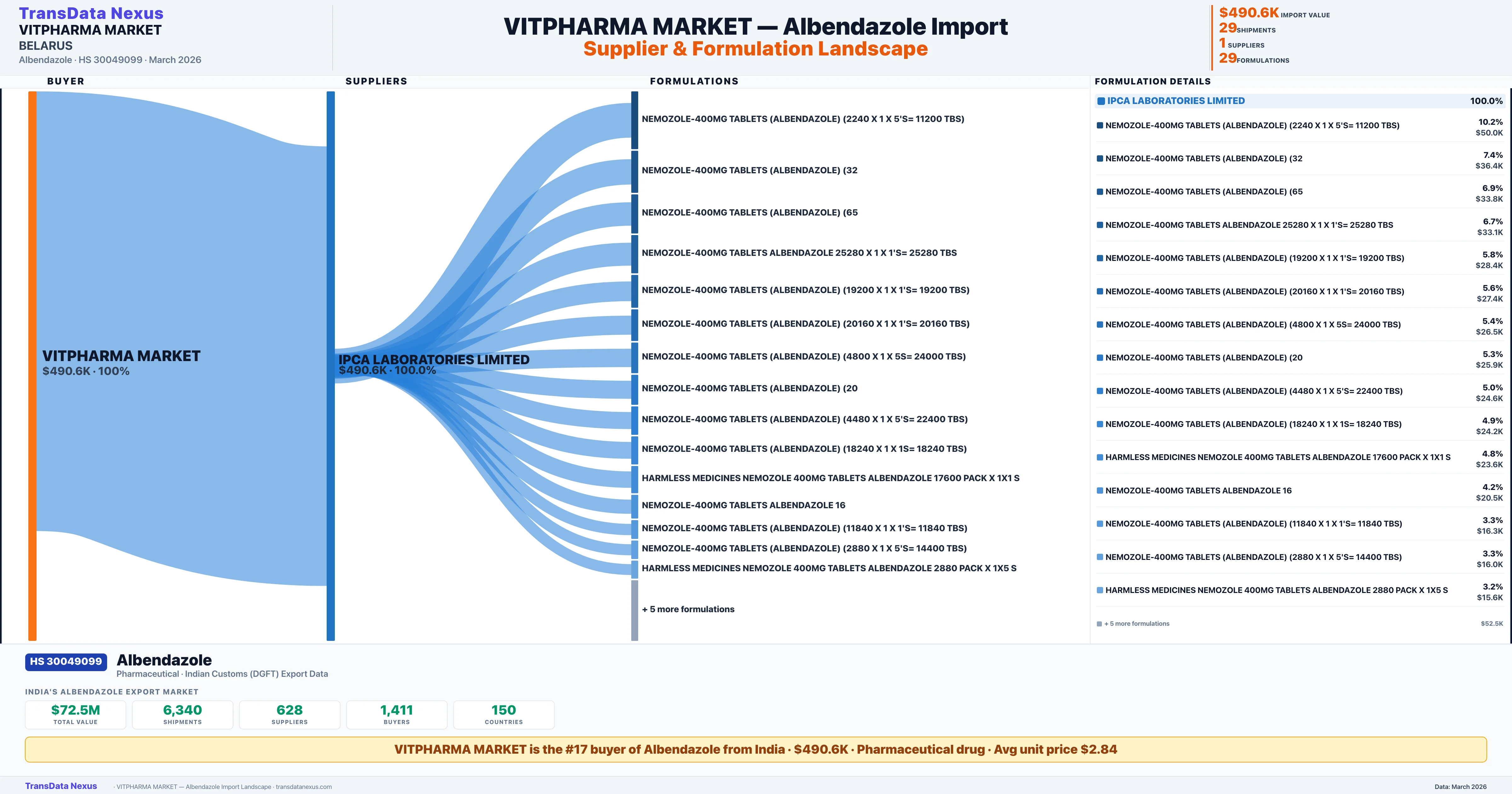 VITPHARMA MARKET sources Albendazole from 1 verified Indian supplier based on 29 customs records. The primary supplier is IPCA LABORATORIES LIMITED accounting for 100.0% of imports.