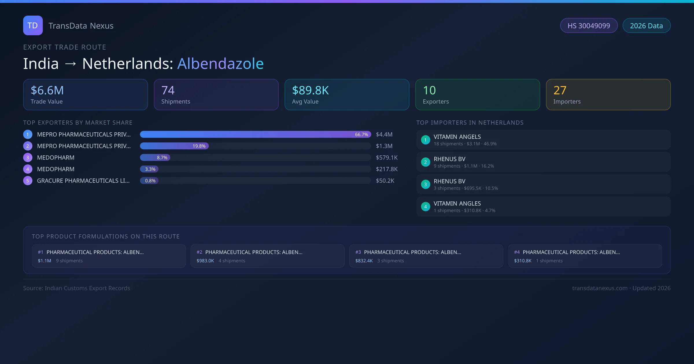 - 1.Route Identification: India to Netherlands export trade corridor identified from Indian Customs (DGFT) records for Albendazole.