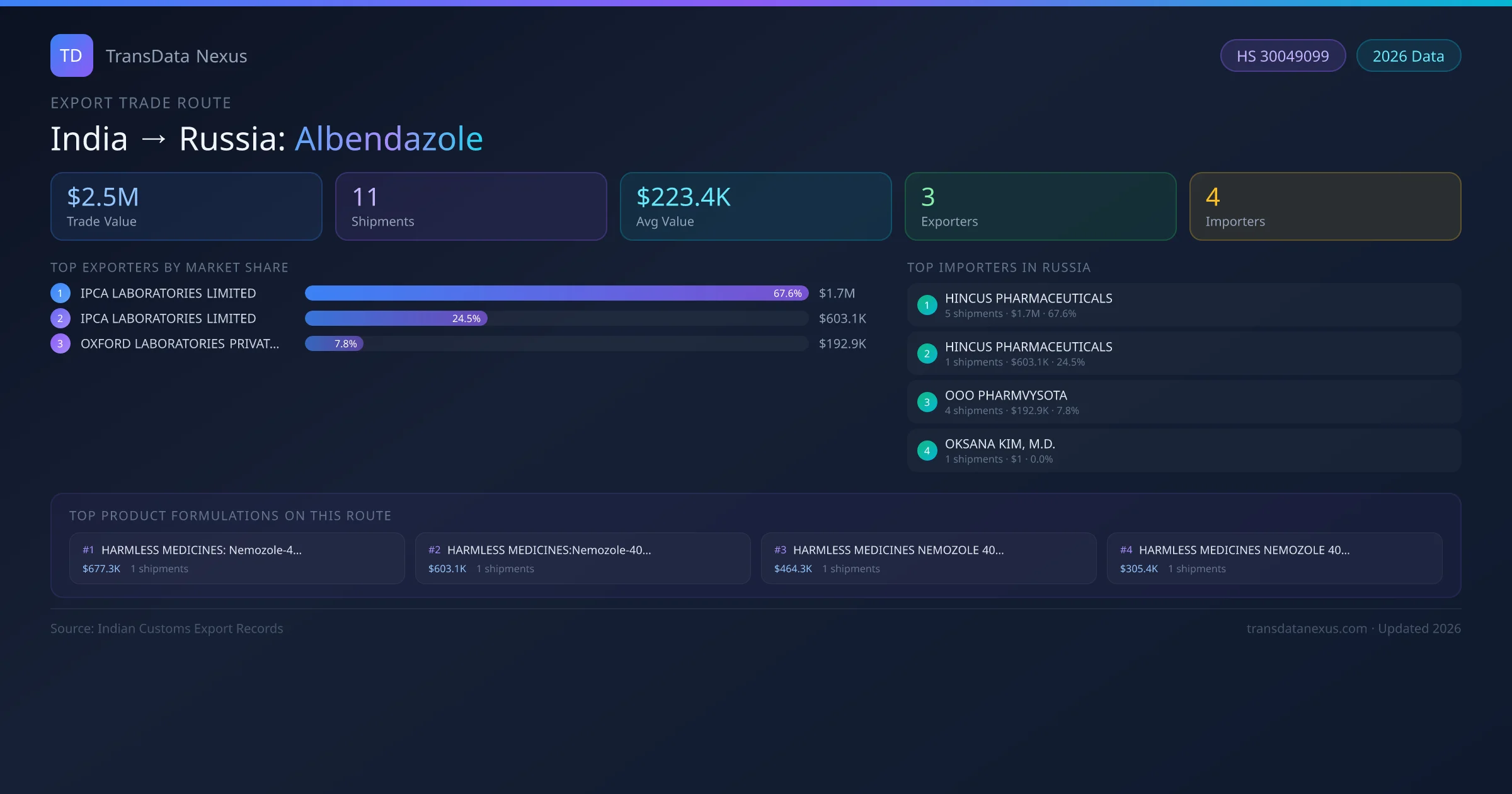 India has recorded 11 verified shipments of Albendazole exported to Russia, representing a combined trade value of $2.5M USD. This corridor is served by 3 active Indian exporters, with an average shipment value of $223.4K USD. The leading Indian exporter is IPCA LABORATORIES LIMITED, which accounts for 68% of total export value with 5 shipments worth $1.7M USD. On the buying side, HINCUS PHARMACEUTICALS is the largest importer in Russia with $1.7M USD in purchases. The top 3 suppliers — IPCA LABORATORIES LIMITED, IPCA LABORATORIES LIMITED , OXFORD LABORATORIES PRIVATE LIMITED — together control 100% of total trade value on this route. All data sourced from Indian Customs (DGFT) shipping bill records. Values reported in FOB USD.