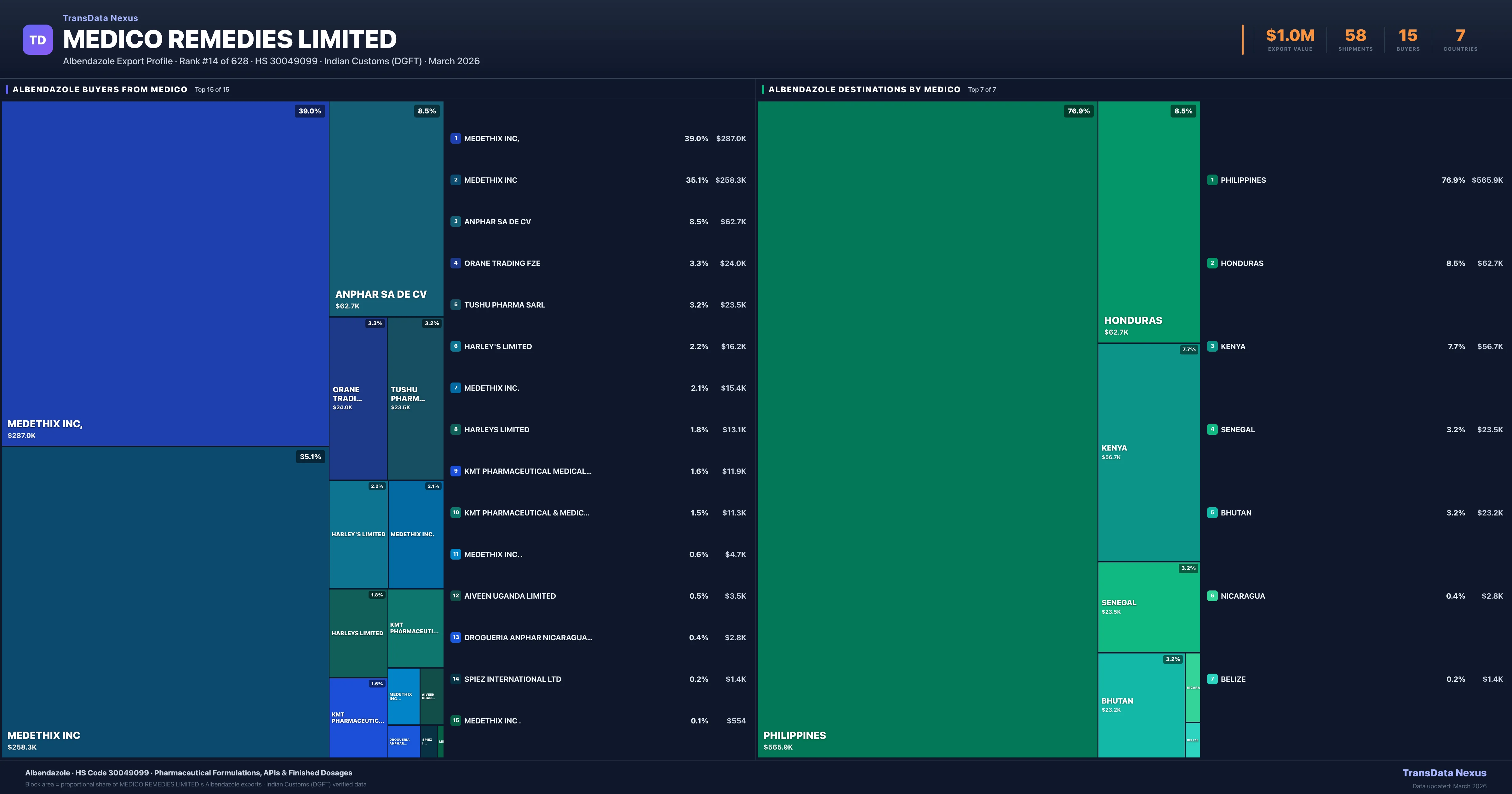 - 4.Verified Records: This page is backed by 58 individual customs records matching Medico Remedies Limited exporting Albendazole, covering 42 formulations to 7 countries via 15 buyers.