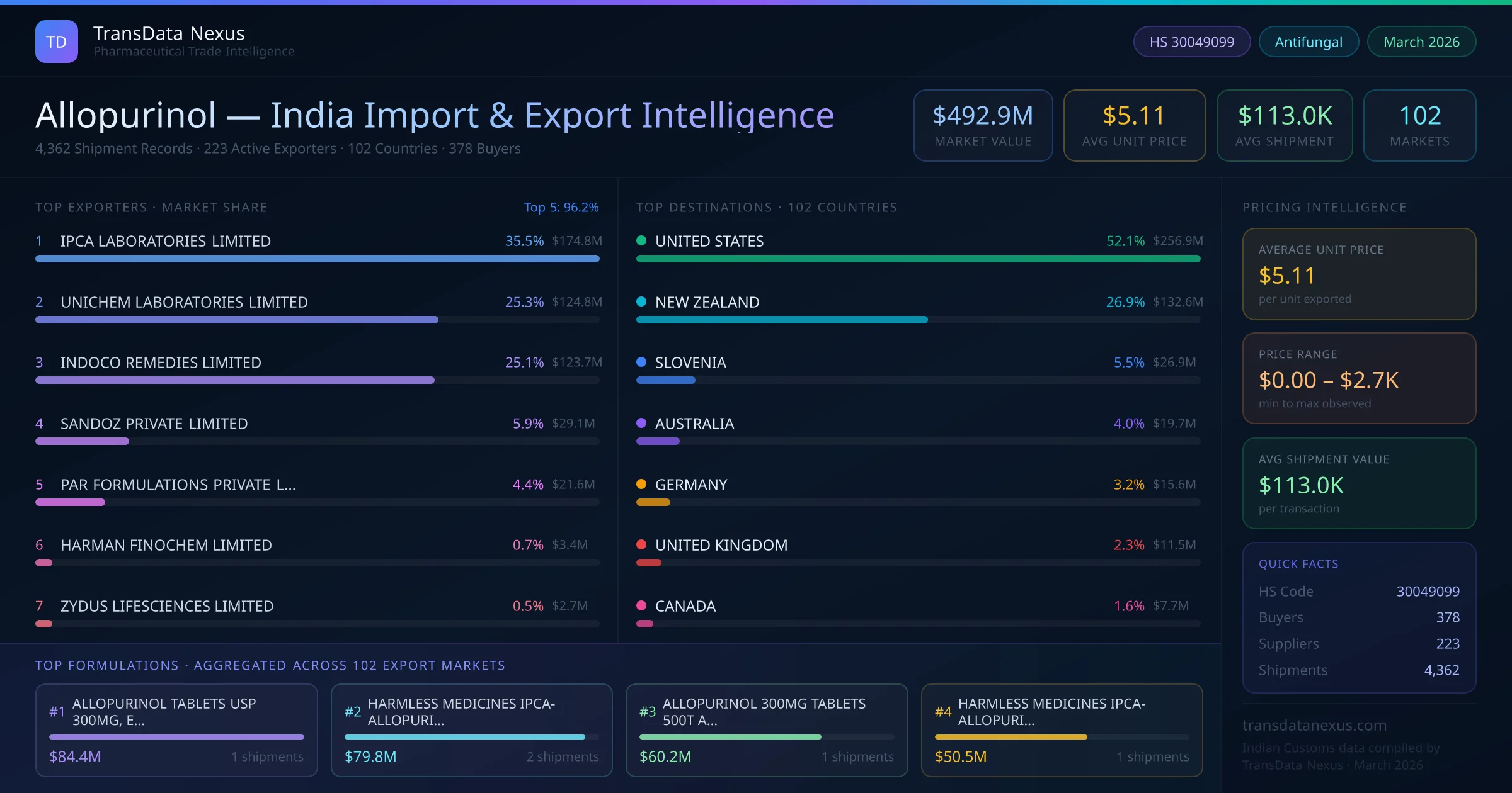 Between 2022 and 2026, India exported $492.9M worth of allopurinol across 4,362 verified shipments to 102 countries — covering 52% of world markets in the Lipid & Metabolism segment. The largest destination is UNITED STATES (52.1%). IPCA LABORATORIES LIMITED leads with a 35.5% share. All figures are drawn from Indian Customs (DGFT) shipping bill records spanning four years of trade activity.