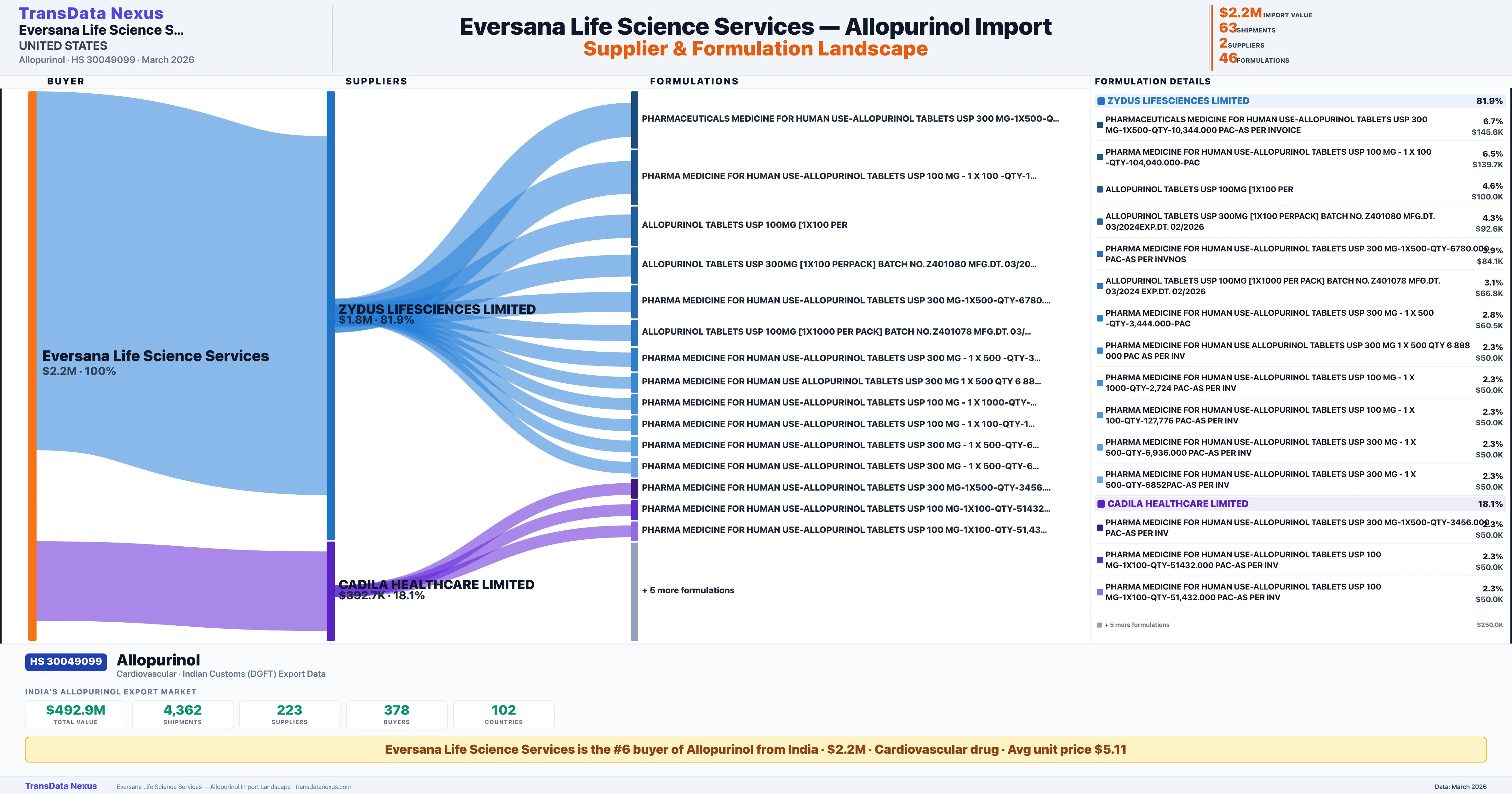 EVERSANA LIFE SCIENCE SERVICES sources Allopurinol from 2 verified Indian suppliers: ZYDUS LIFESCIENCES LIMITED ($1.8M, 81.9%), CADILA HEALTHCARE LIMITED ($392.7K, 18.1%). This is based on 63 customs records.