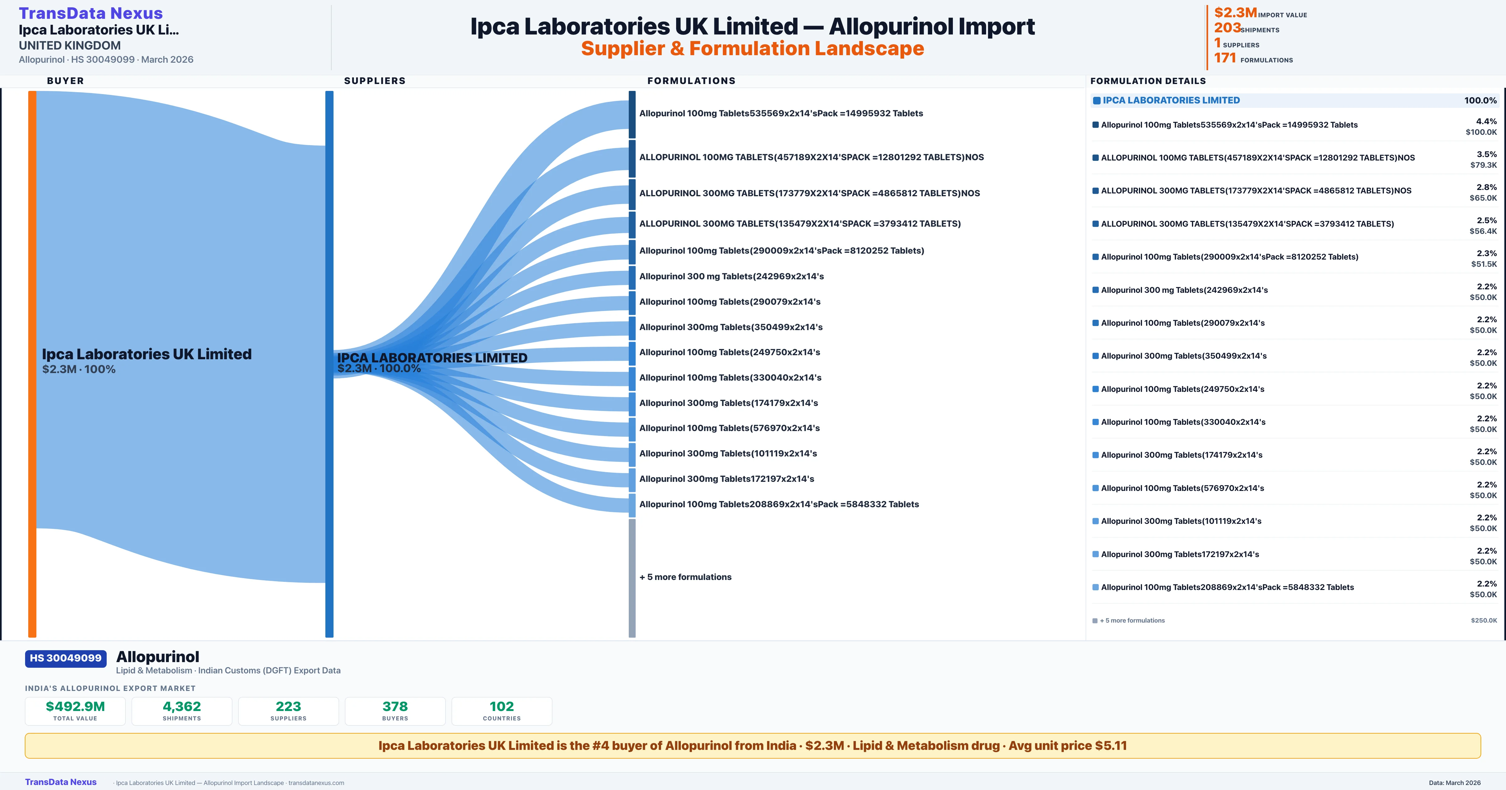 IPCA LABORATORIES UK LIMITED sources Allopurinol from 1 verified Indian supplier: IPCA LABORATORIES LIMITED ($2.3M, 100.0%). This is based on 203 customs records.
