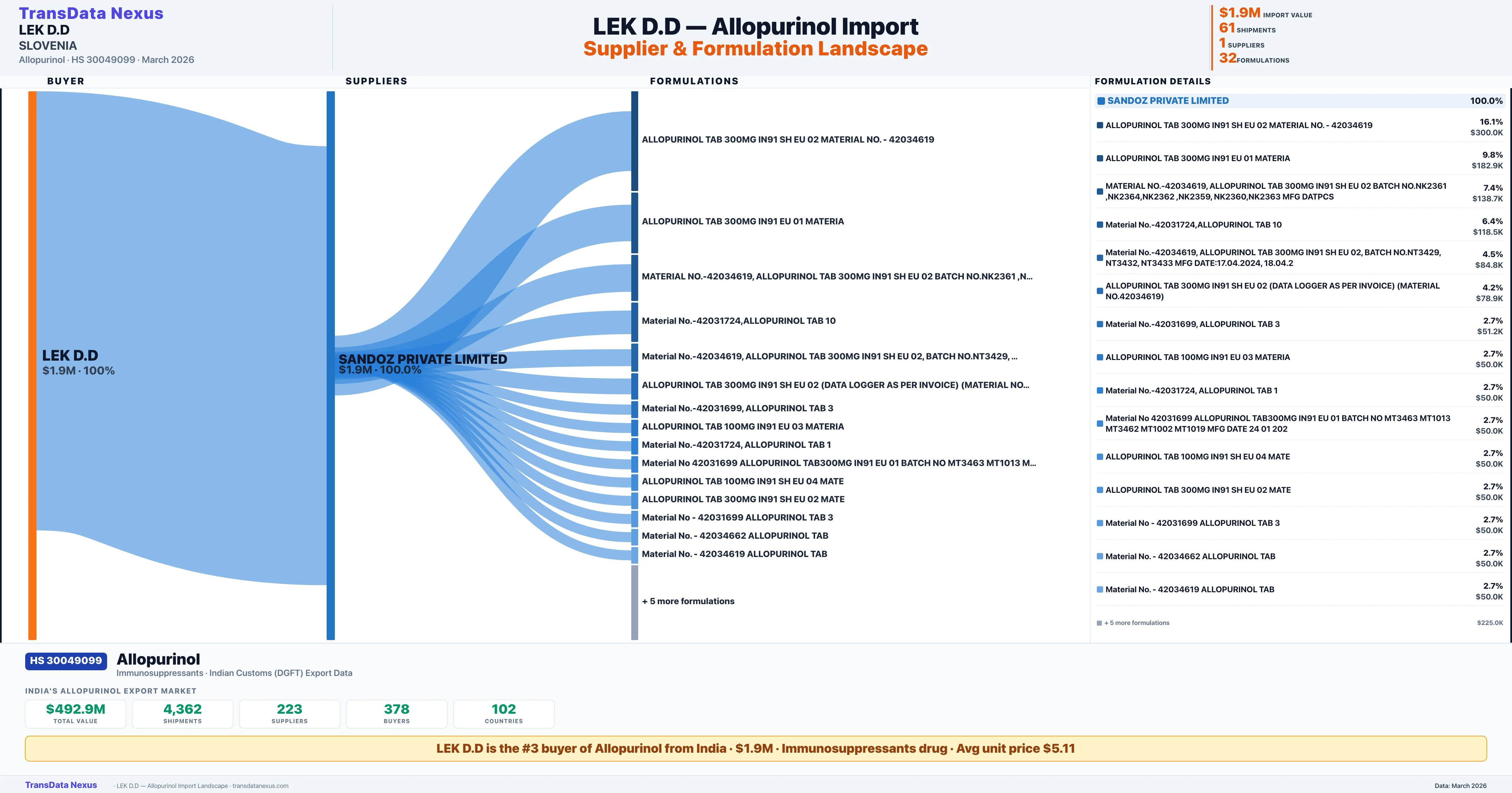 LEK D.D sources Allopurinol from 1 verified Indian supplier: SANDOZ PRIVATE LIMITED ($1.9M, 100.0%). This is based on 61 customs records.