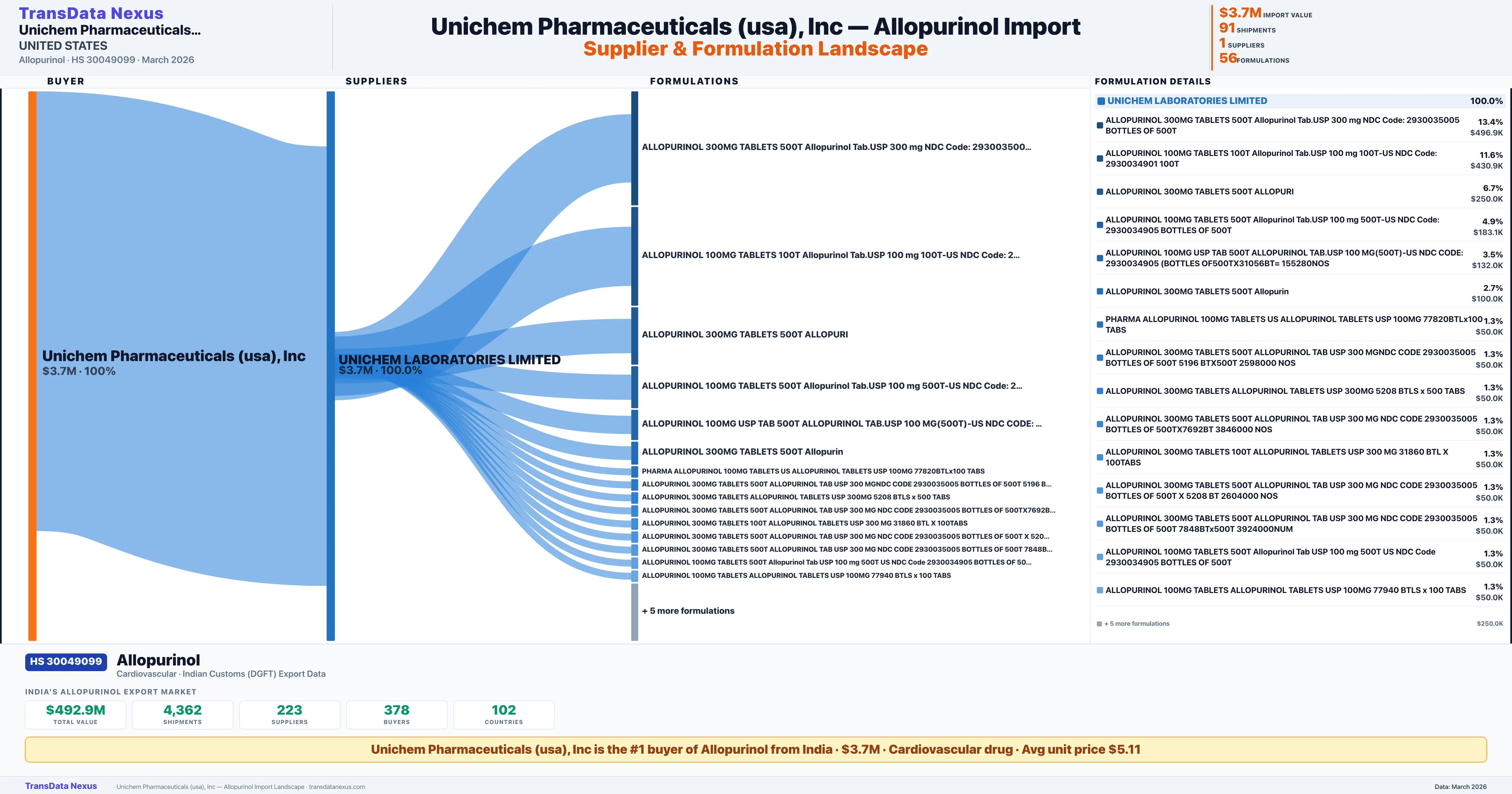UNICHEM PHARMACEUTICALS (USA) INC sources Allopurinol from 1 verified Indian supplier: UNICHEM LABORATORIES LIMITED ($3.7M, 100.0%). This is based on 91 customs records.