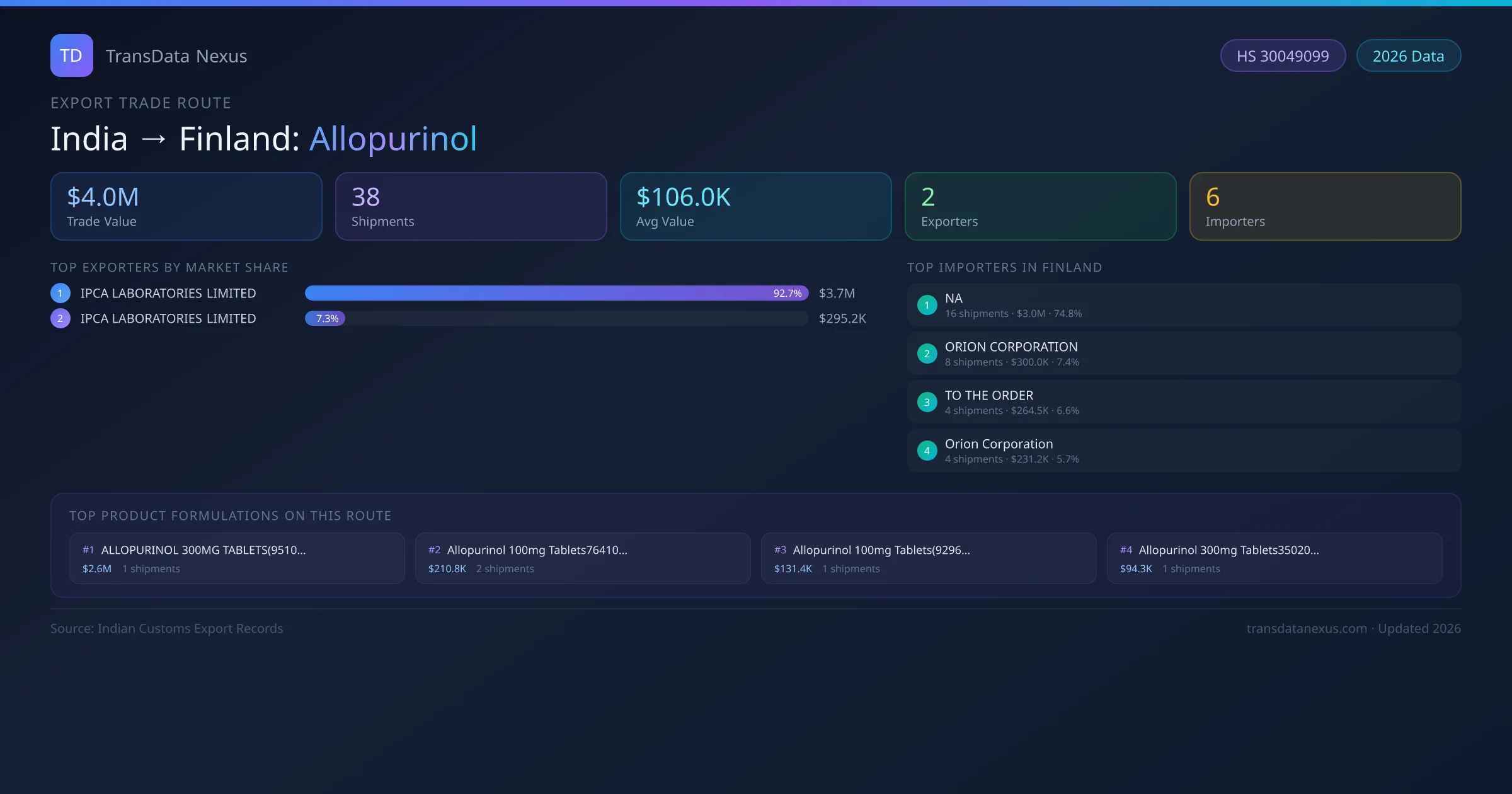 India exports Allopurinol to Finland worth approximately $4.0M USD across 38 recorded shipments. The average value per shipment is $106.0K USD.