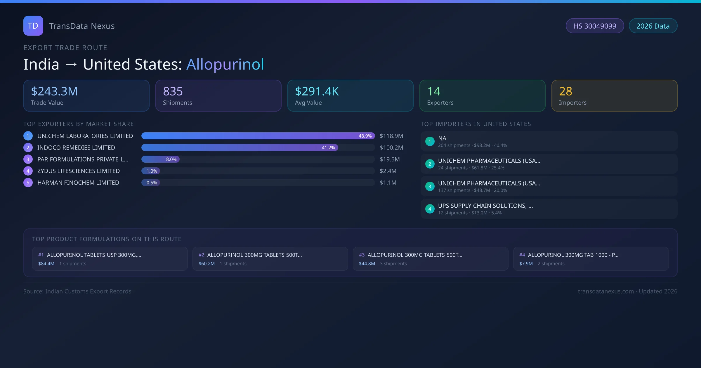The India to United States Allopurinol corridor is one of India's established pharmaceutical export routes, with 835 shipments documented worth a combined $243.3M USD. The route is dominated by UNICHEM LABORATORIES LIMITED, which alone accounts for roughly 49% of all export value, reflecting the consolidated nature of India's allopurinol manufacturing sector.