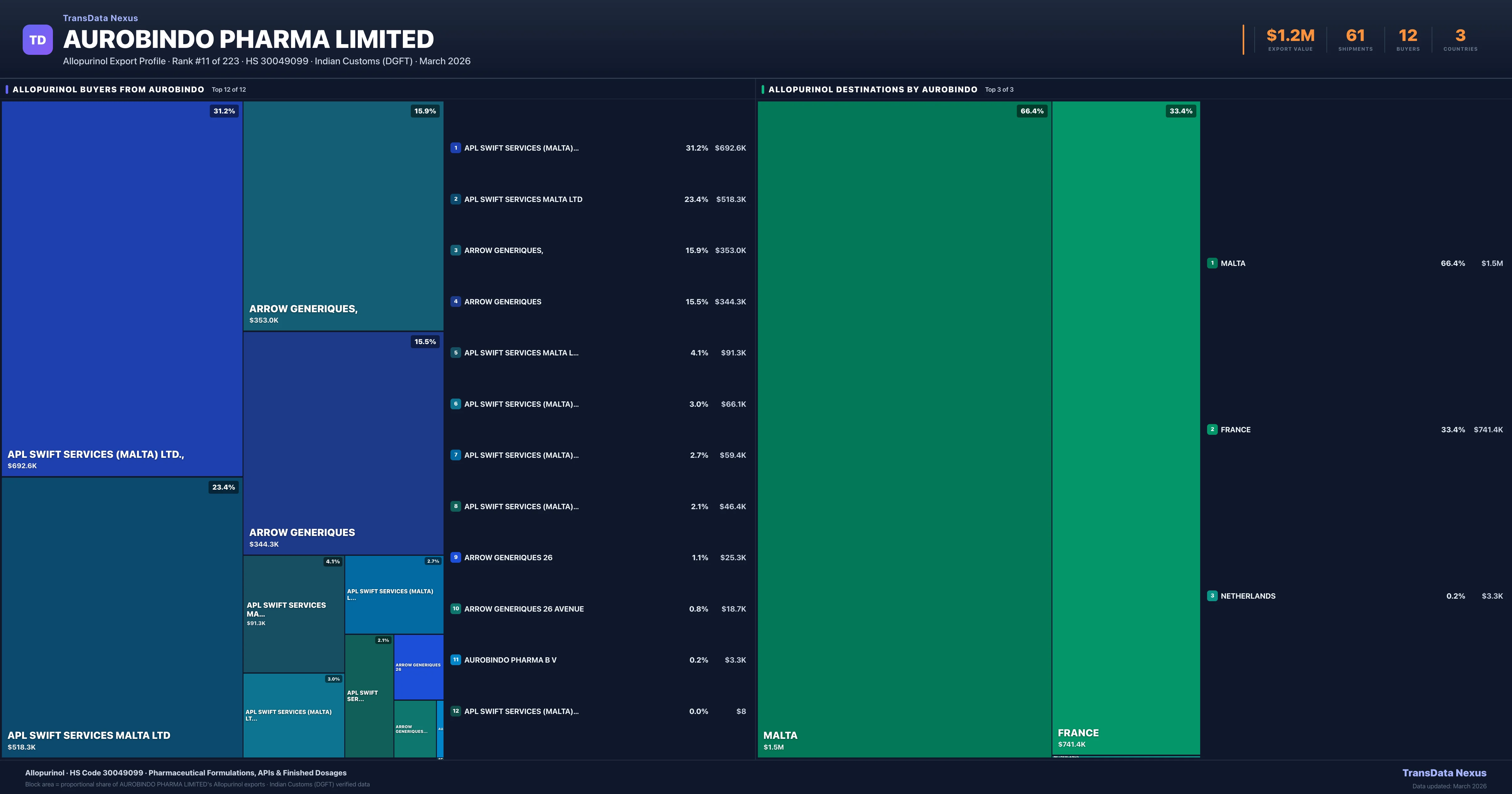 Aurobindo Pharma Limited supplies Allopurinol to 12 buyers globally. The largest buyer is APL SWIFT SERVICES (MALTA) LTD., (MALTA), followed by APL SWIFT SERVICES MALTA LTD (MALTA) and ARROW GENERIQUES, (FRANCE). These buyers represent pharmaceutical distributors, hospital groups, and government procurement agencies in their respective markets.