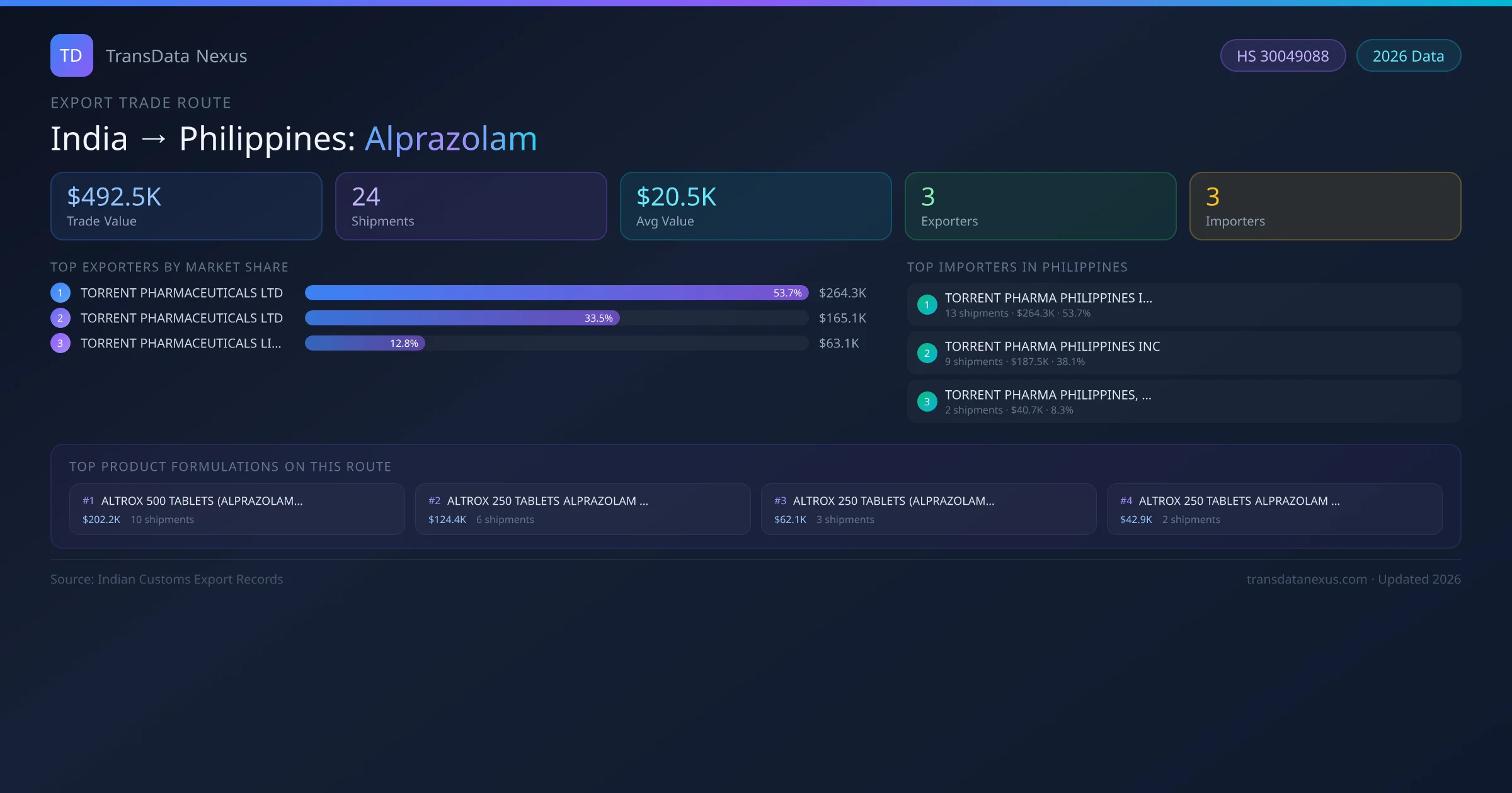India has recorded 24 verified shipments of Alprazolam exported to Philippines, representing a combined trade value of $492.5K USD. This corridor is served by 3 active Indian exporters, with an average shipment value of $20.5K USD. The leading Indian exporter is TORRENT PHARMACEUTICALS LTD , which accounts for 54% of total export value with 13 shipments worth $264.3K USD. On the buying side, TORRENT PHARMA PHILIPPINES INC, is the largest importer in Philippines with $264.3K USD in purchases. The top 3 suppliers — TORRENT PHARMACEUTICALS LTD , TORRENT PHARMACEUTICALS LTD, TORRENT PHARMACEUTICALS LIMITED — together control 100% of total trade value on this route. All data sourced from Indian Customs (DGFT) shipping bill records. Values reported in FOB USD.