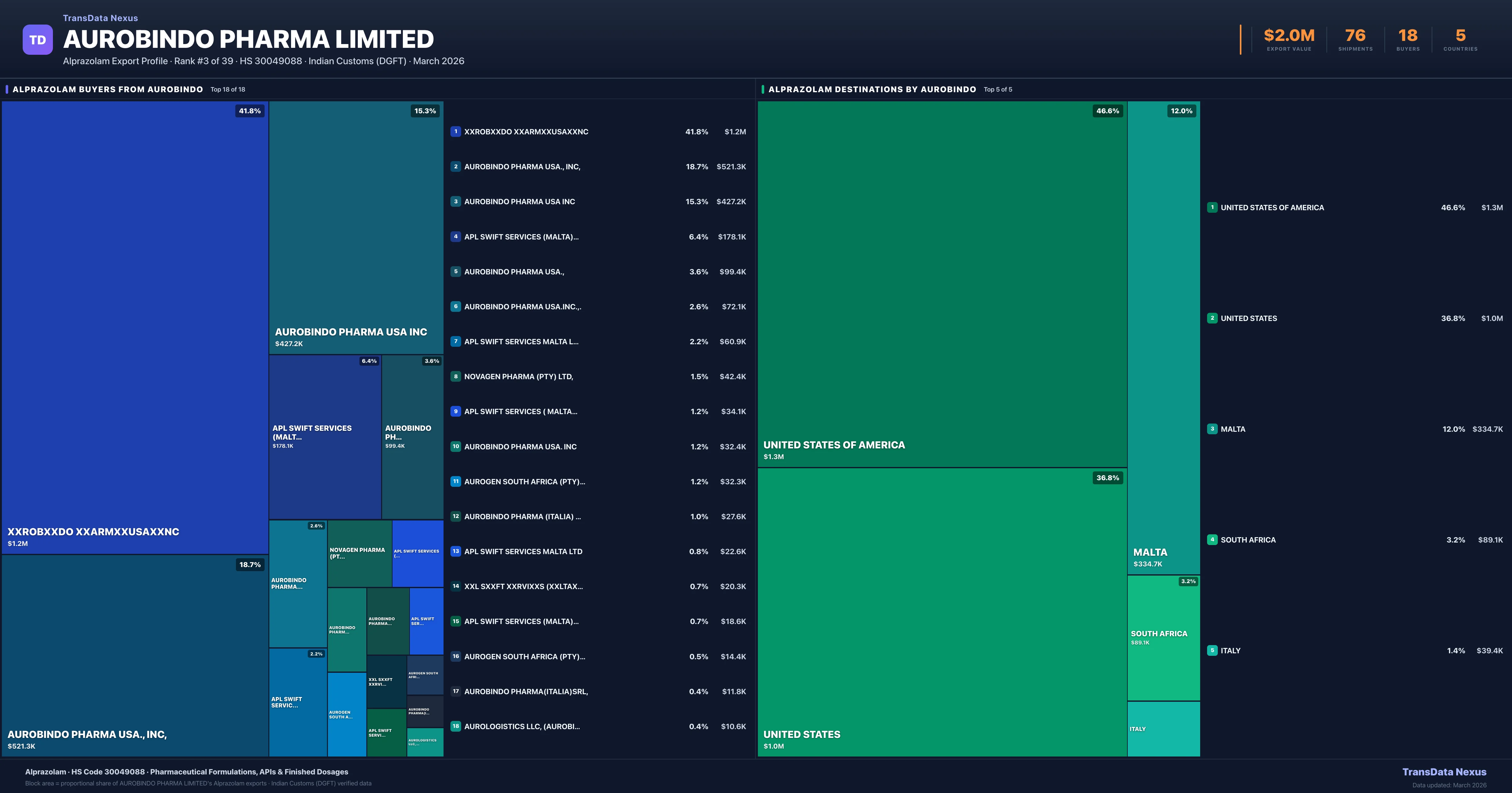 Access shipment-level details, pricing data, buyer connections, and competitive analysis for Aurobindo Pharma Limited's Alprazolam exports. TransData Nexus provides verified Indian Customs (DGFT) data trusted by pharmaceutical trade professionals worldwide.