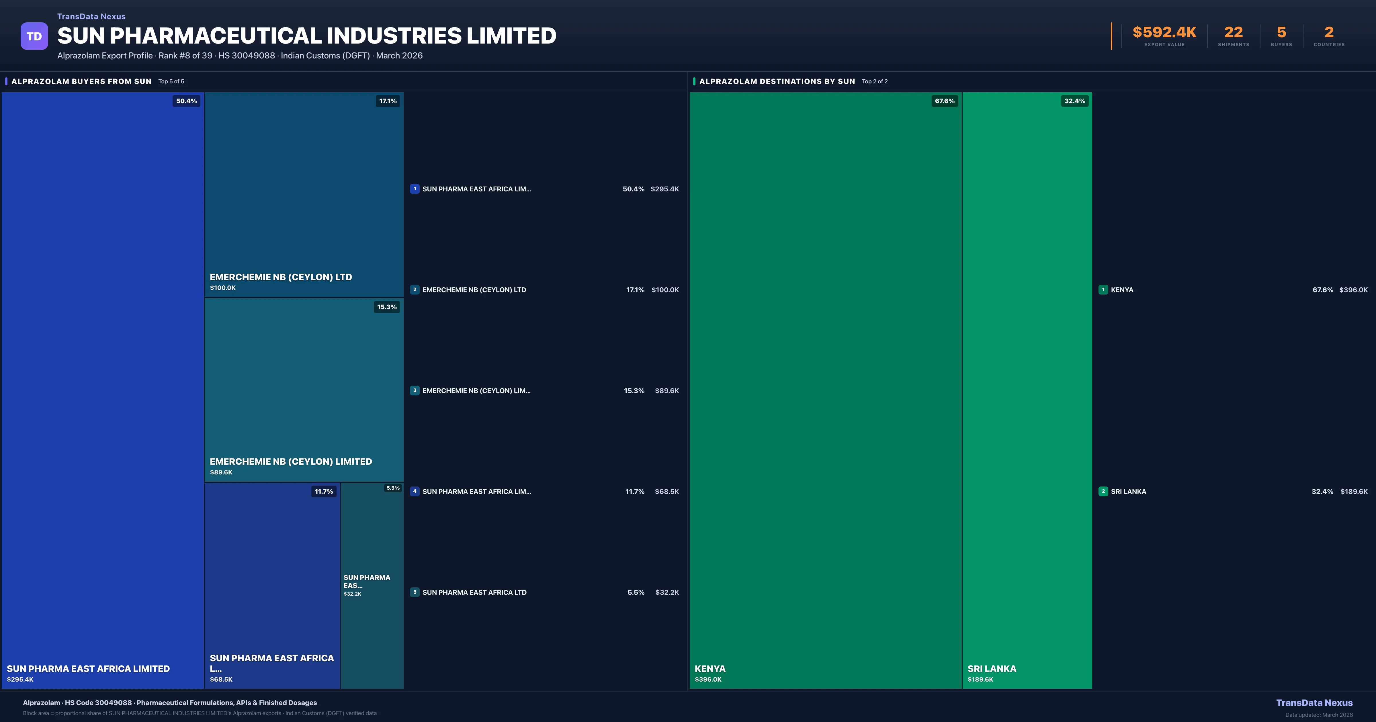 SUN Pharmaceutical Industries Limited supplies Alprazolam to 5 buyers globally. The largest buyer is SUN PHARMA EAST AFRICA LIMITED (KENYA), followed by EMERCHEMIE NB (CEYLON) LTD (SRI LANKA) and EMERCHEMIE NB (CEYLON) LIMITED (SRI LANKA). These buyers represent pharmaceutical distributors, hospital groups, and government procurement agencies in their respective markets.