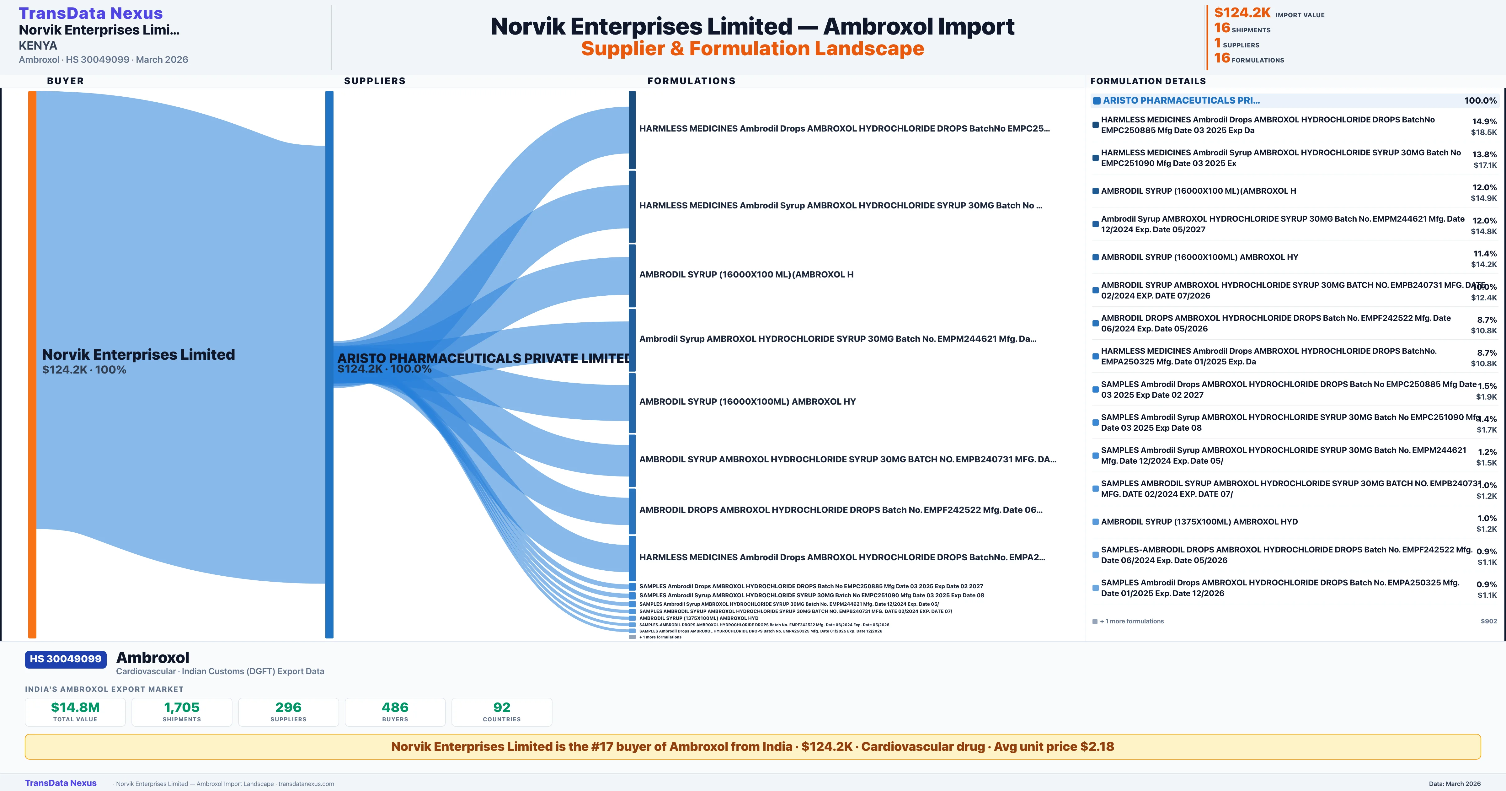 NORVIK ENTERPRISES LIMITED sources Ambroxol from 1 verified Indian supplier: ARISTO PHARMACEUTICALS PRIVATE LIMITED ($124.2K, 100.0%). This is based on 16 customs records.