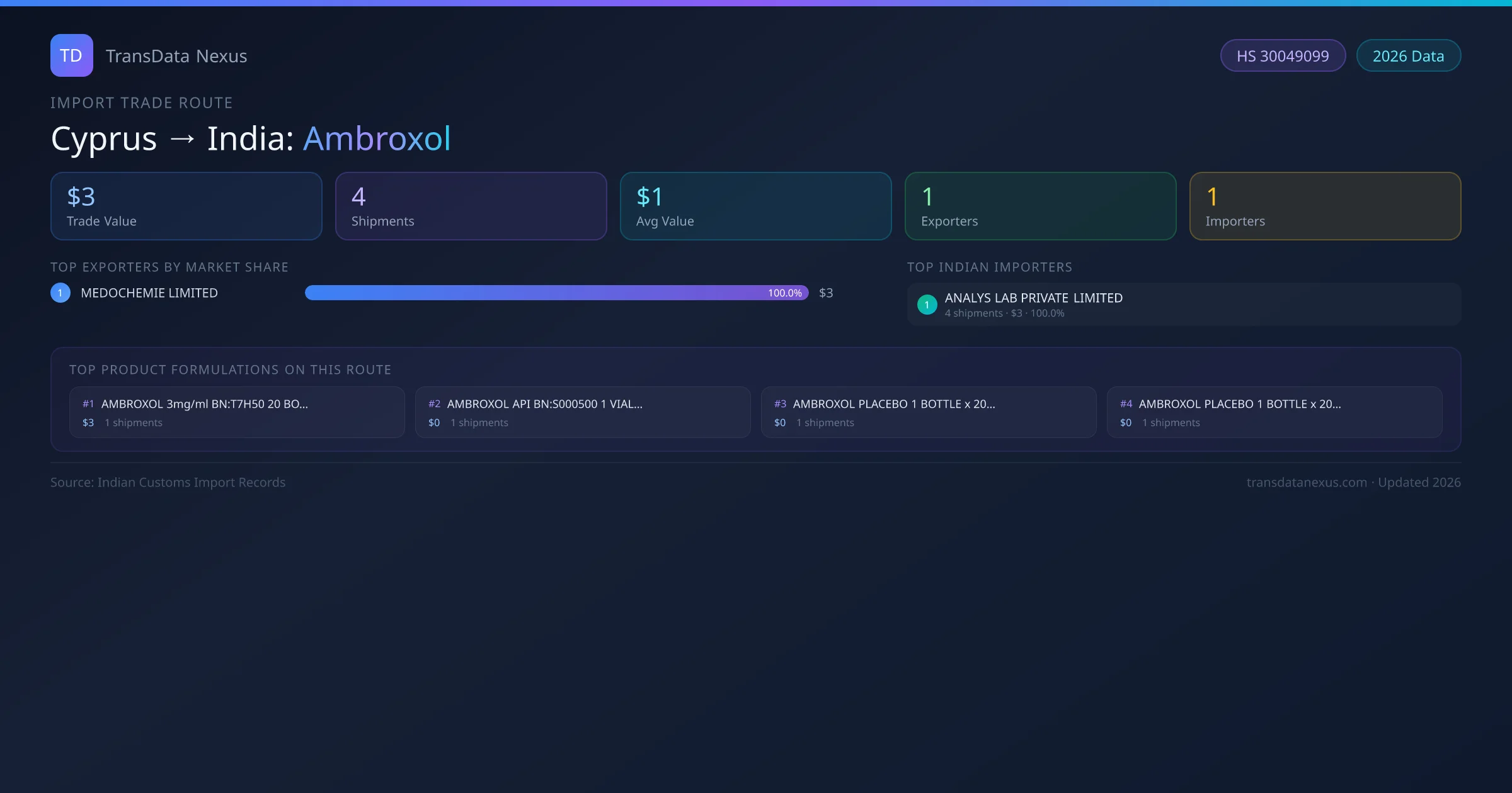 The Cyprus to India Ambroxol corridor is one of India's established pharmaceutical import routes from Cyprus, with 4 shipments documented worth a combined $3 USD. The route is dominated by MEDOCHEMIE LIMITED, which alone accounts for roughly 100% of all import value, reflecting the consolidated nature of Cyprus's ambroxol export sector.