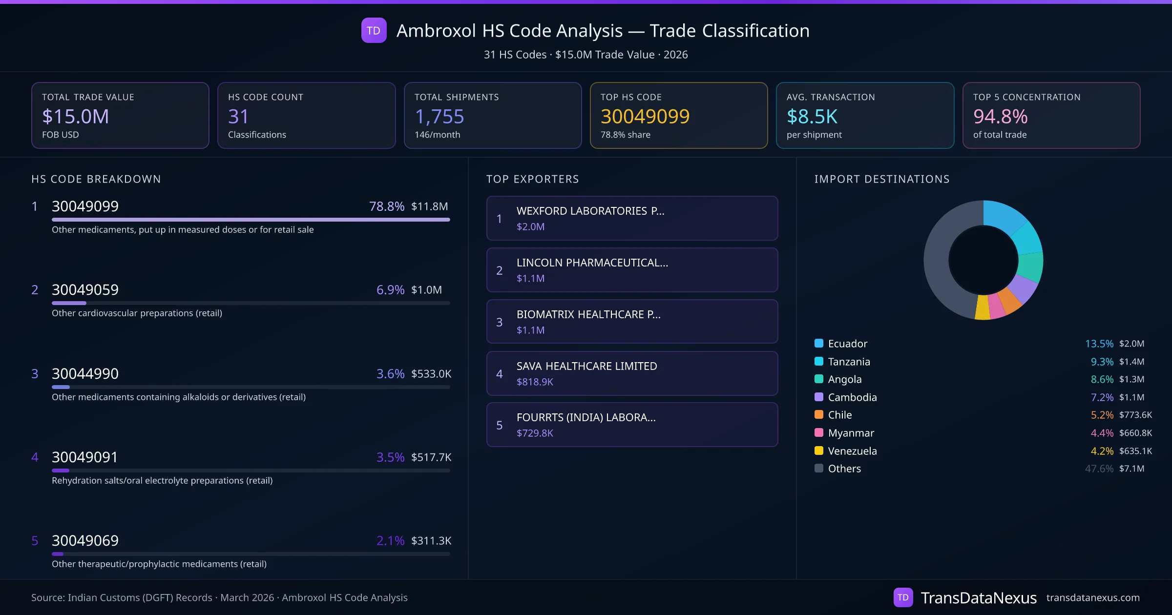 India exports Ambroxol under 31 distinct HS code classifications, representing a total trade value of $15.0M across 1,755 shipments. The dominant classification is HS 30049099 (Other medicaments, put up in measured doses or for retail sale), accounting for 78.8% of all Ambroxol trade at $11.8M. HS 30049059 (Other cardiovascular preparations (retail)) follows at 6.9% ($1.0M). The top 5 HS codes together account for 94.8% of total Ambroxol trade from India. The average transaction value is $8531. Key importing markets include Ecuador, Tanzania, Angola. Leading exporters include WEXFORD LABORATORIES PRIVATE LIMITED and LINCOLN PHARMACEUTICALS LTD. Data sourced from Indian Customs (DGFT) shipping bill records.
