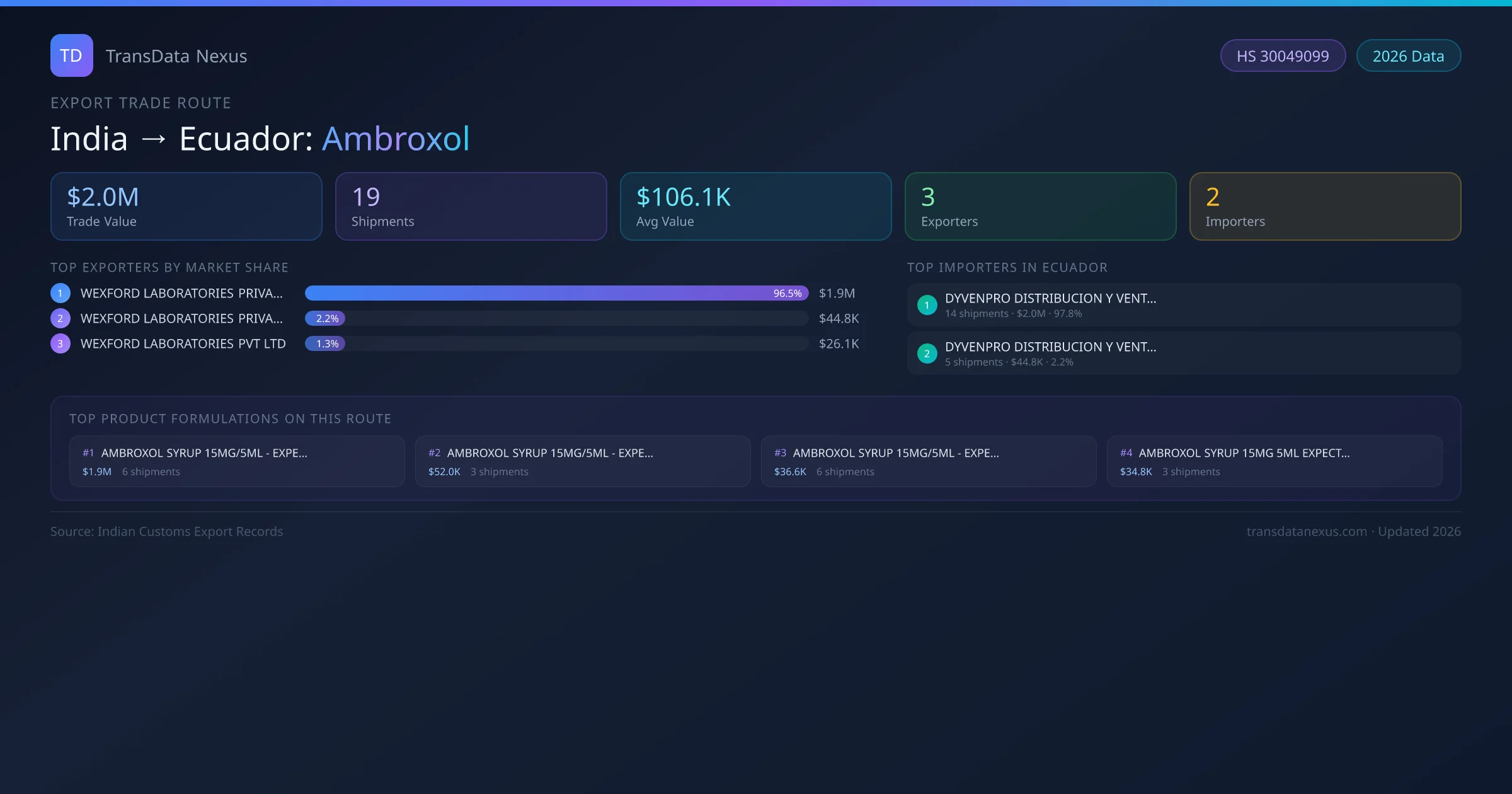 - 1.Route Identification: India to Ecuador export trade corridor identified from Indian Customs (DGFT) records for Ambroxol.