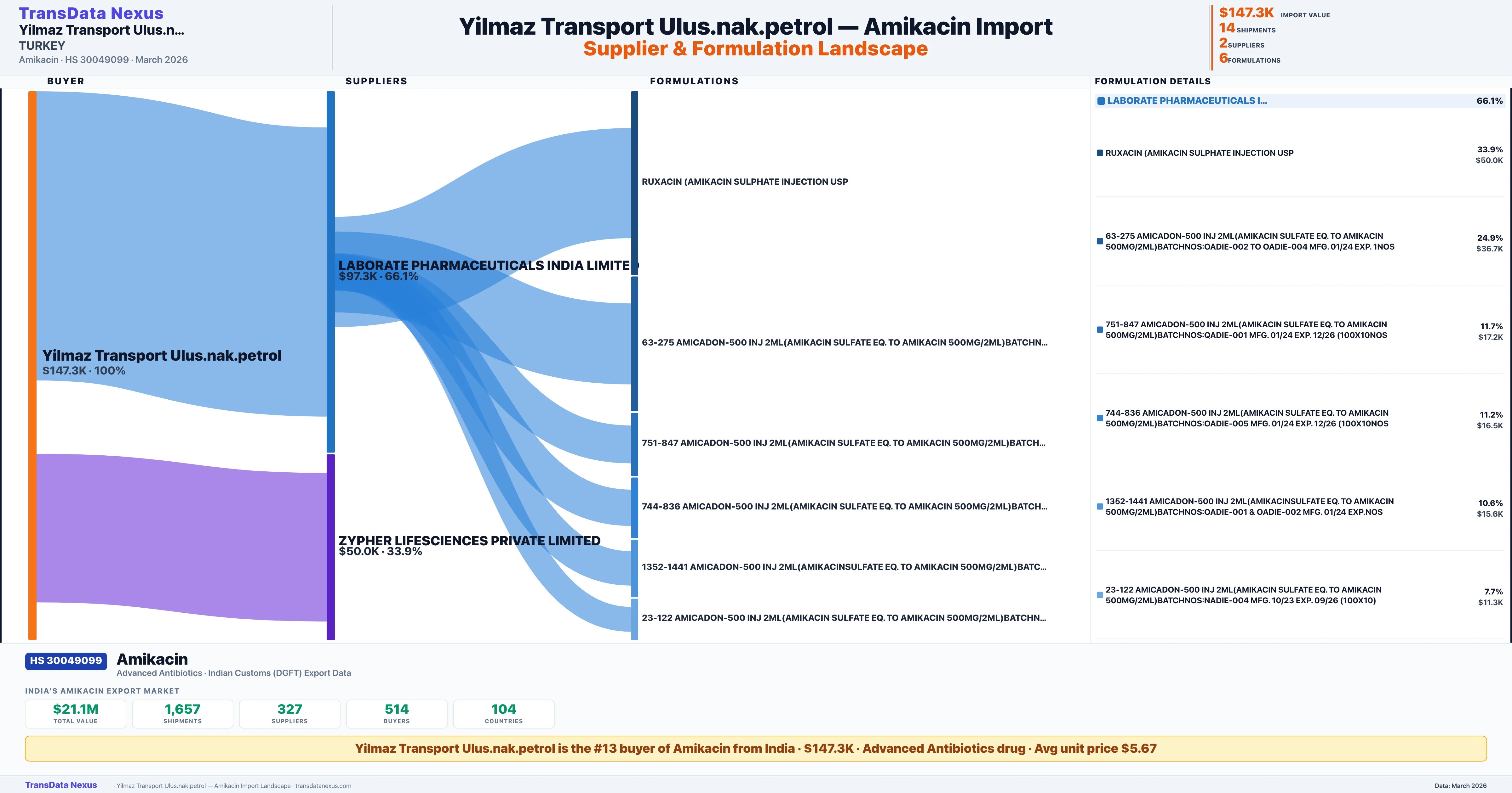 YILMAZ TRANSPORT ULUS.NAK.PETROL sources Amikacin from 2 verified Indian suppliers based on 14 customs records. The primary supplier is LABORATE PHARMACEUTICALS INDIA LIMITED accounting for 66.1% of imports.