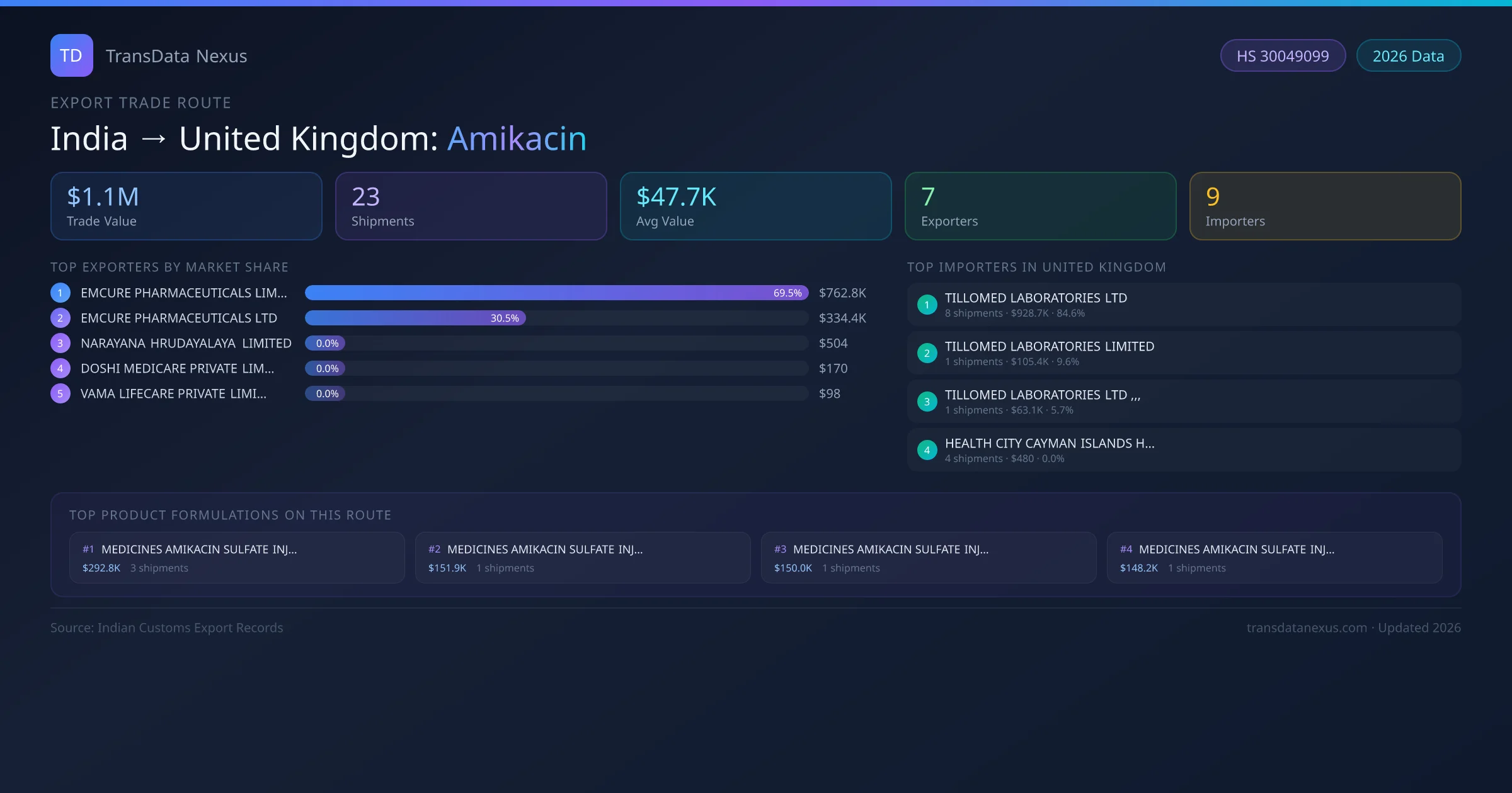 India exports Amikacin to United Kingdom worth approximately $1.1M USD across 23 recorded shipments. The average value per shipment is $47.7K USD.