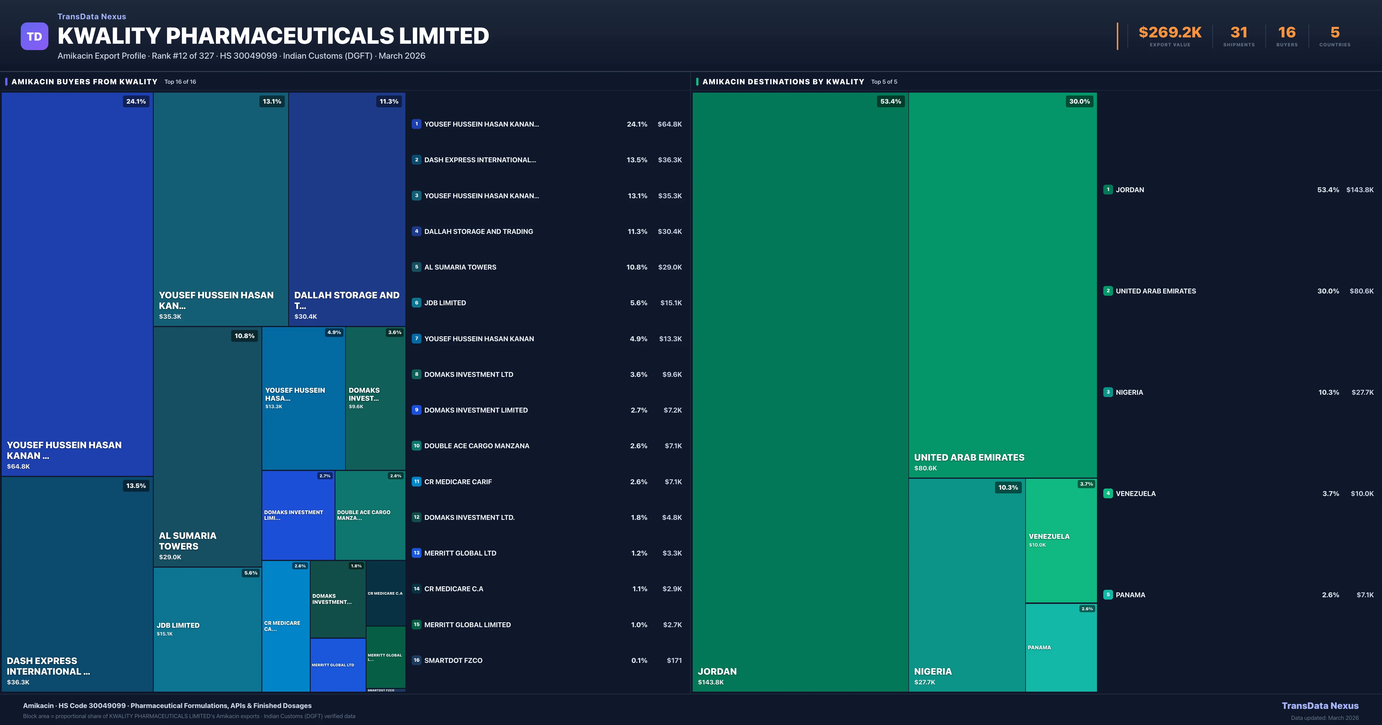 Access shipment-level details, pricing data, buyer connections, and competitive analysis for Kwality Pharmaceuticals Limited's Amikacin exports. TransData Nexus provides verified Indian Customs (DGFT) data trusted by pharmaceutical trade professionals worldwide.