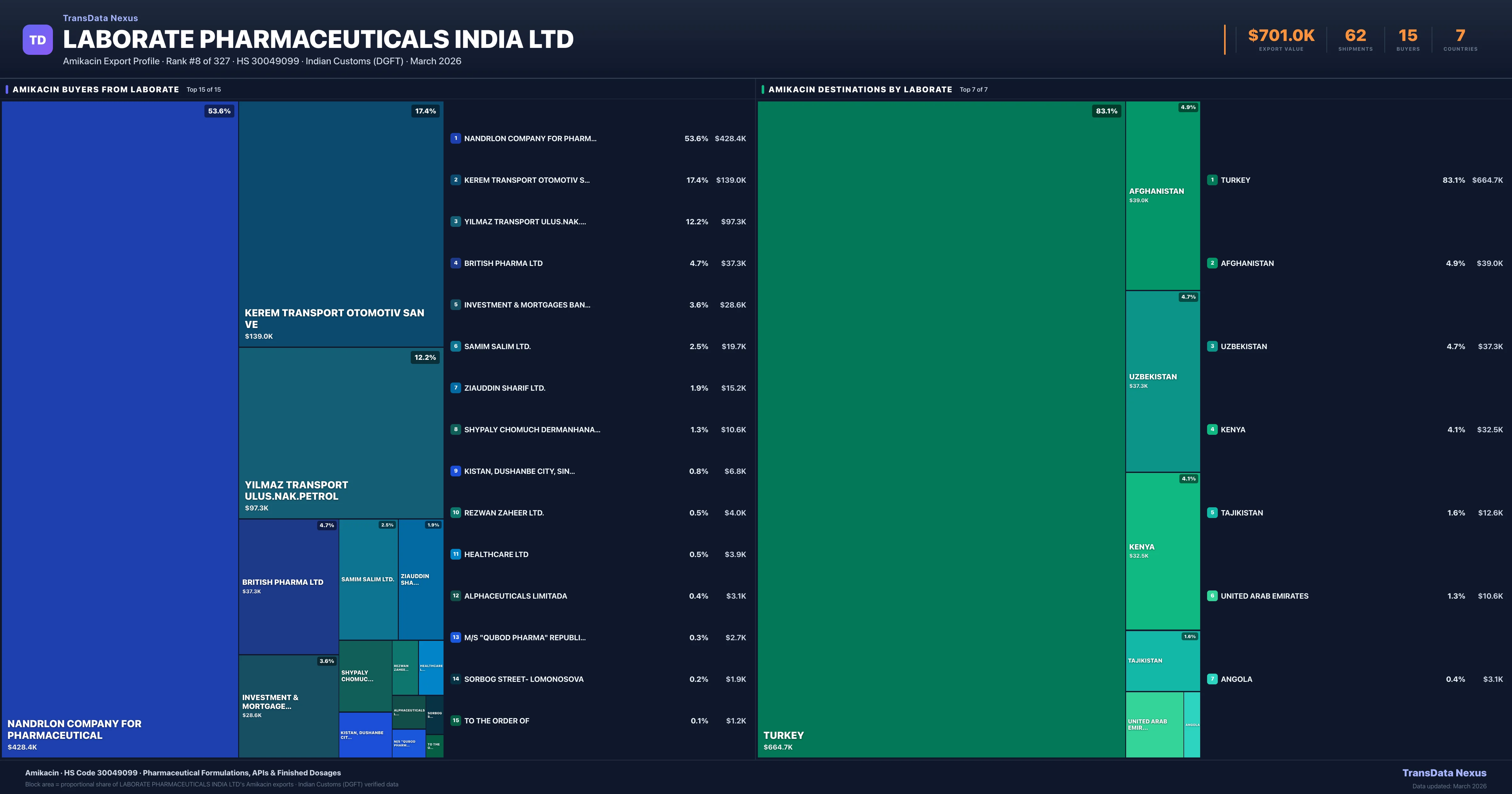 Laborate Pharmaceuticals India Ltd supplies Amikacin to 15 buyers globally. The largest buyer is NANDRLON COMPANY FOR PHARMACEUTICAL (TURKEY), followed by KEREM TRANSPORT OTOMOTIV SAN VE (TURKEY) and YILMAZ TRANSPORT ULUS.NAK.PETROL (TURKEY). These buyers represent pharmaceutical distributors, hospital groups, and government procurement agencies in their respective markets.