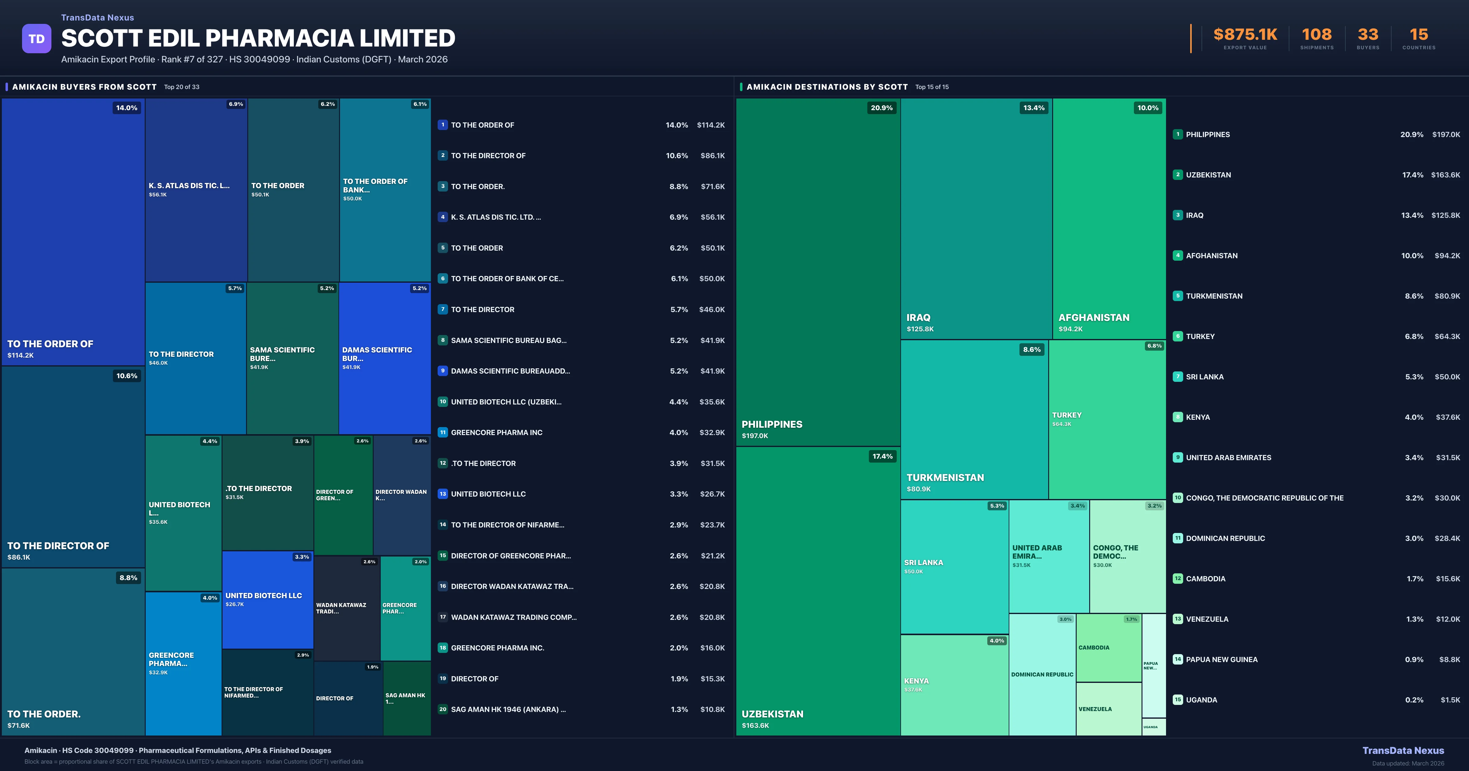 Scott Edil Pharmacia Limited supplies Amikacin to 33 buyers globally. The largest buyer is TO THE ORDER OF (IRAQ), followed by TO THE DIRECTOR OF (KENYA) and TO THE ORDER. (UZBEKISTAN). These buyers represent pharmaceutical distributors, hospital groups, and government procurement agencies in their respective markets.