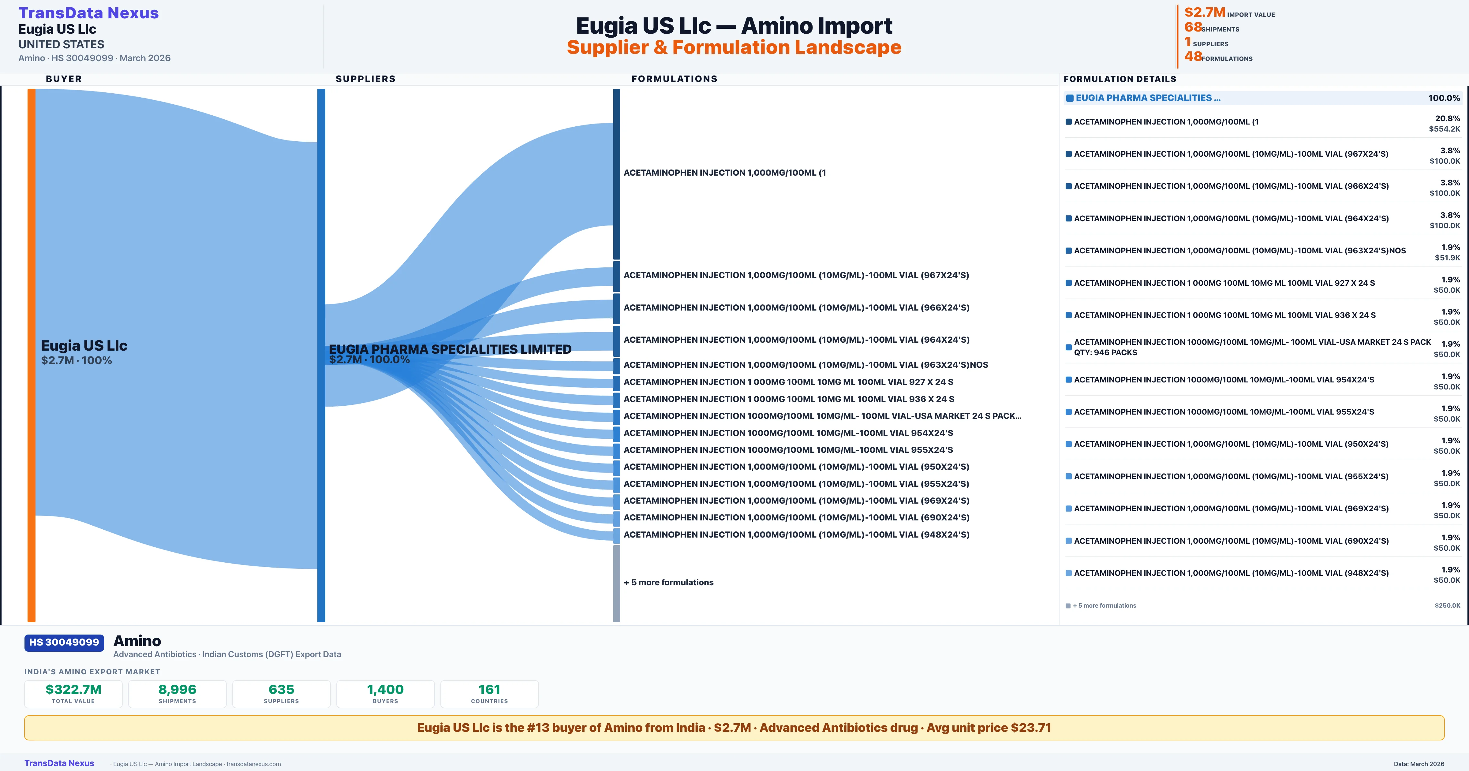 EUGIA US LLC imports 48 distinct Amino formulations from India. The top formulation is ACETAMINOPHEN INJECTION 1,000MG/100ML (1 with 14 shipments worth $554.2K.