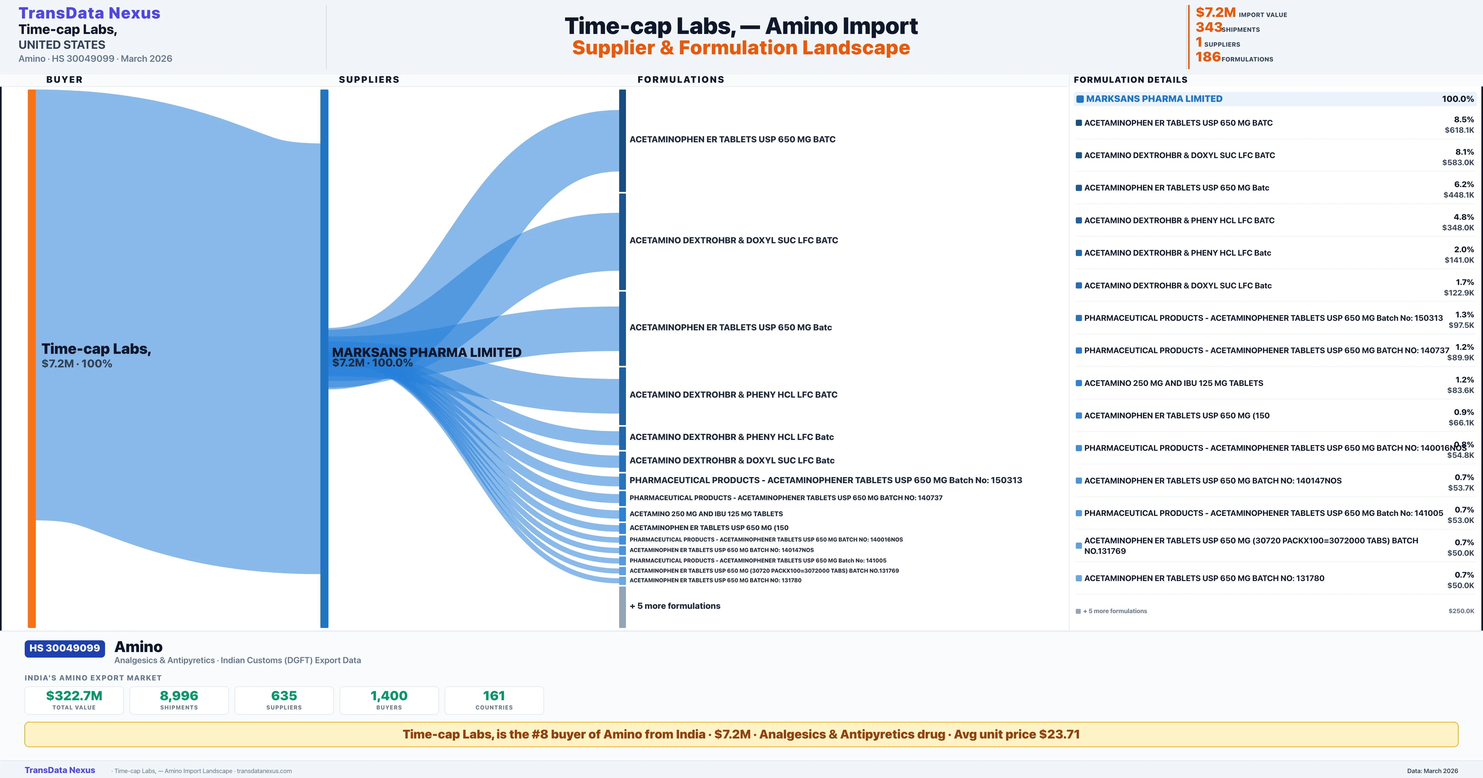 TIME-CAP LABS, sources Amino from 1 verified Indian supplier: MARKSANS PHARMA LIMITED ($7.2M, 100.0%). This is based on 343 customs records.