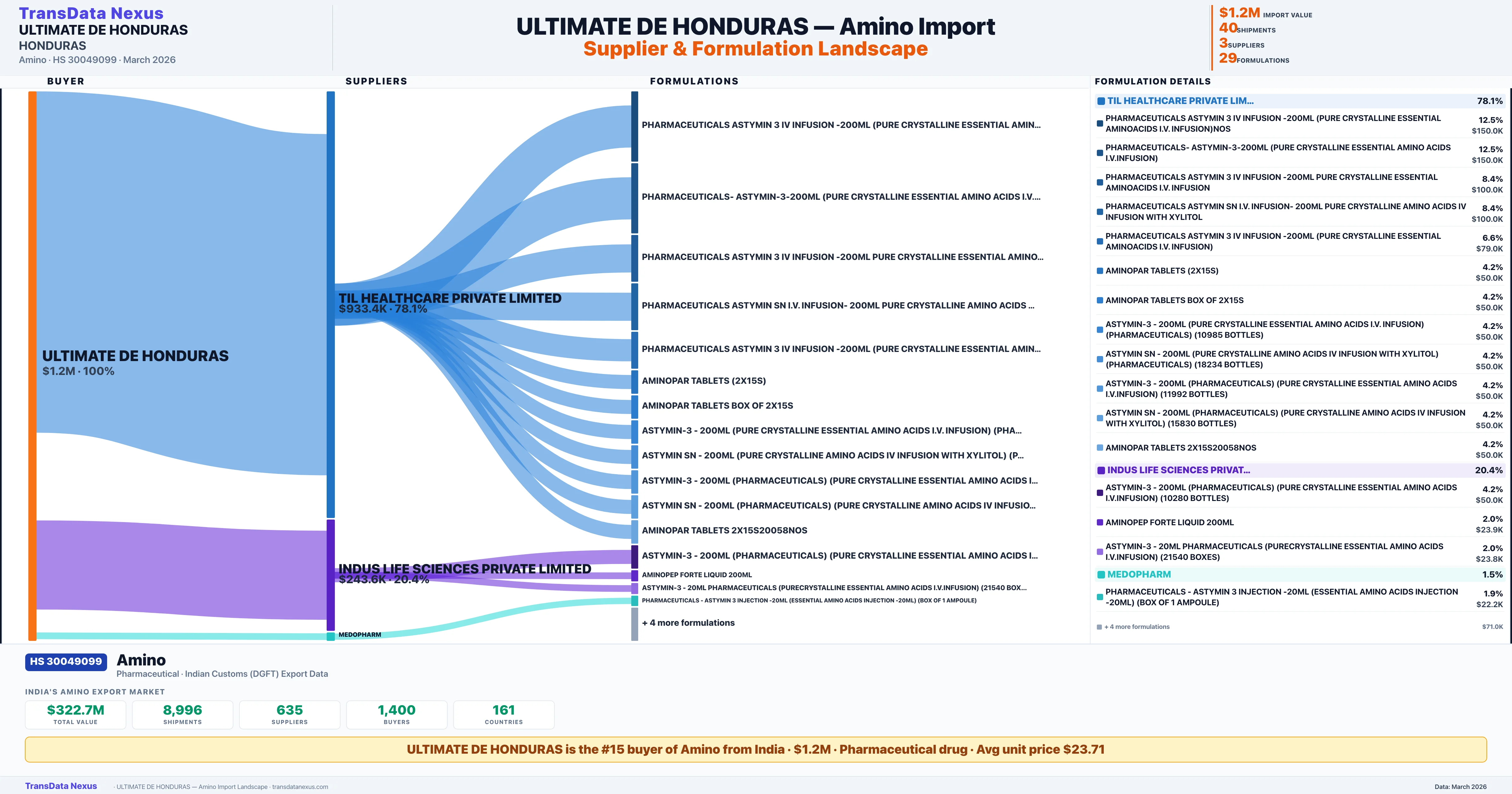 ULTIMATE DE HONDURAS sources Amino from 3 verified Indian suppliers: TIL HEALTHCARE PRIVATE LIMITED ($933.4K, 78.1%), INDUS LIFE SCIENCES PRIVATE LIMITED ($243.6K, 20.4%), MEDOPHARM ($18.4K, 1.5%). This is based on 40 customs records.