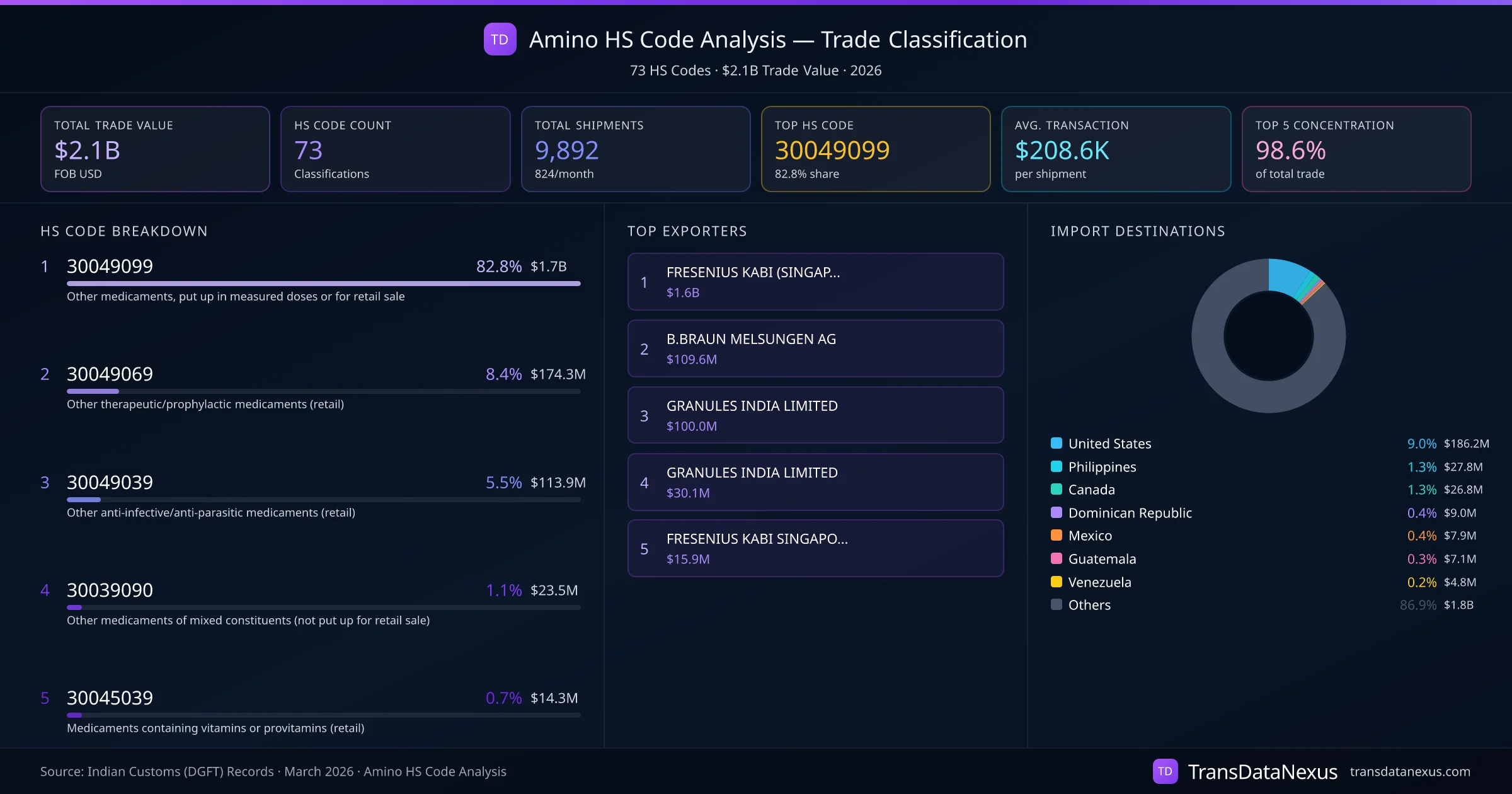 India exports Amino under 73 distinct HS code classifications, representing a total trade value of $2.1B across 9,892 shipments. The dominant classification is HS 30049099 (Other medicaments, put up in measured doses or for retail sale), accounting for 82.8% of all Amino trade at $1.7B. HS 30049069 (Other therapeutic/prophylactic medicaments (retail)) follows at 8.4% ($174.3M). The top 5 HS codes together account for 98.6% of total Amino trade from India. The average transaction value is $208573. Key importing markets include United States, Philippines, Canada. Leading exporters include FRESENIUS KABI (SINGAPORE) PTE LTD. and B.BRAUN MELSUNGEN AG . Data sourced from Indian Customs (DGFT) shipping bill records.