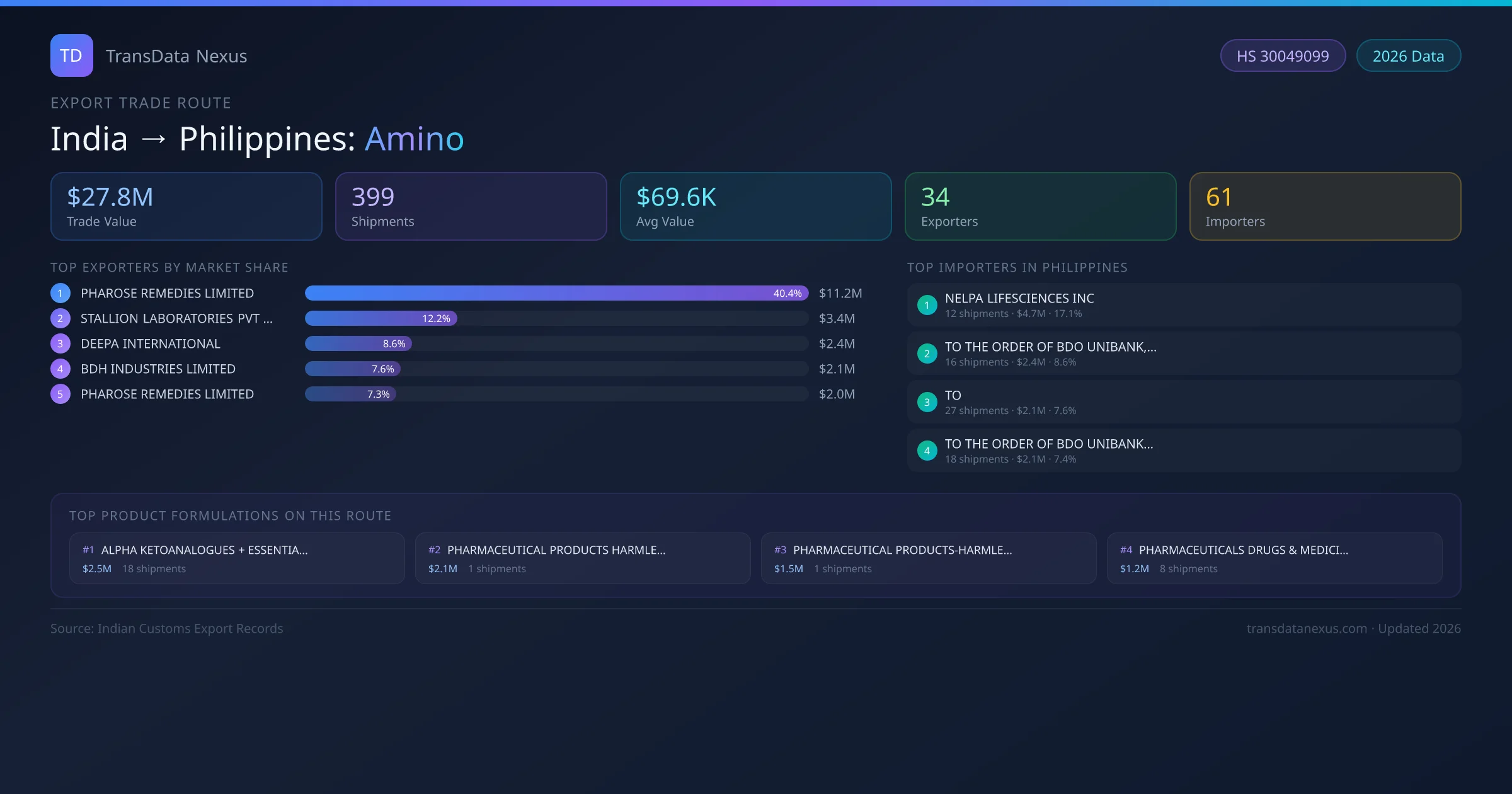 India exports Amino to Philippines worth approximately $27.8M USD across 399 recorded shipments. The average value per shipment is $69.6K USD.