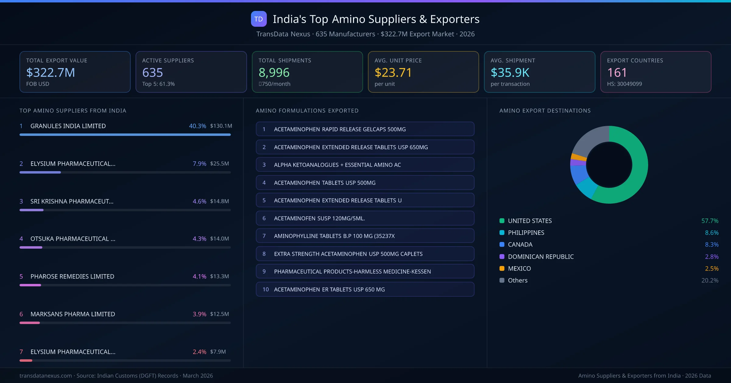 GRANULES INDIA LIMITED is the leading amino exporter from India, holding a 40.3% share of the $322.7M market across 8,996 shipments from 635 exporters. The top 5 suppliers โ GRANULES INDIA LIMITED, ELYSIUM PHARMACEUTICALS LTD, SRI KRISHNA PHARMACEUTICALS LIMITED, OTSUKA PHARMACEUTICAL INDIA PRIVATE LIMITED, PHAROSE REMEDIES LIMITED โ collectively control 61.3% of total export value, indicating a moderately concentrated market. Individual shares are: GRANULES INDIA LIMITED (40.3%), ELYSIUM PHARMACEUTICALS LTD (7.9%), SRI KRISHNA PHARMACEUTICALS LIMITED (4.6%), OTSUKA PHARMACEUTICAL INDIA PRIVATE LIMITED (4.3%), PHAROSE REMEDIES LIMITED (4.1%).