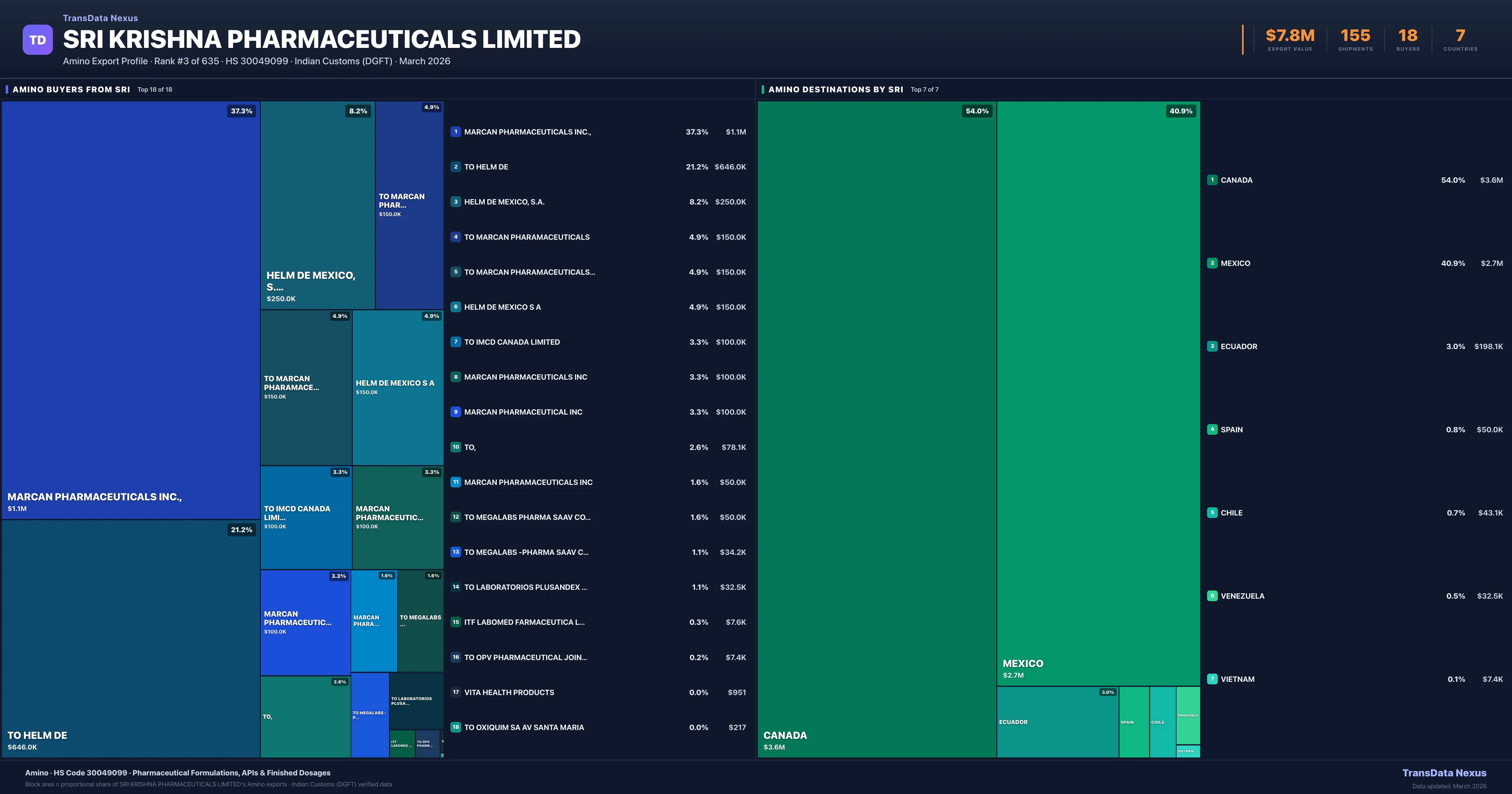 SRI Krishna Pharmaceuticals Limited supplies Amino to 18 buyers globally. The largest buyer is MARCAN PHARMACEUTICALS INC., (CANADA), followed by TO HELM DE (MEXICO) and HELM DE MEXICO, S.A. (MEXICO). These buyers represent pharmaceutical distributors, hospital groups, and government procurement agencies in their respective markets.