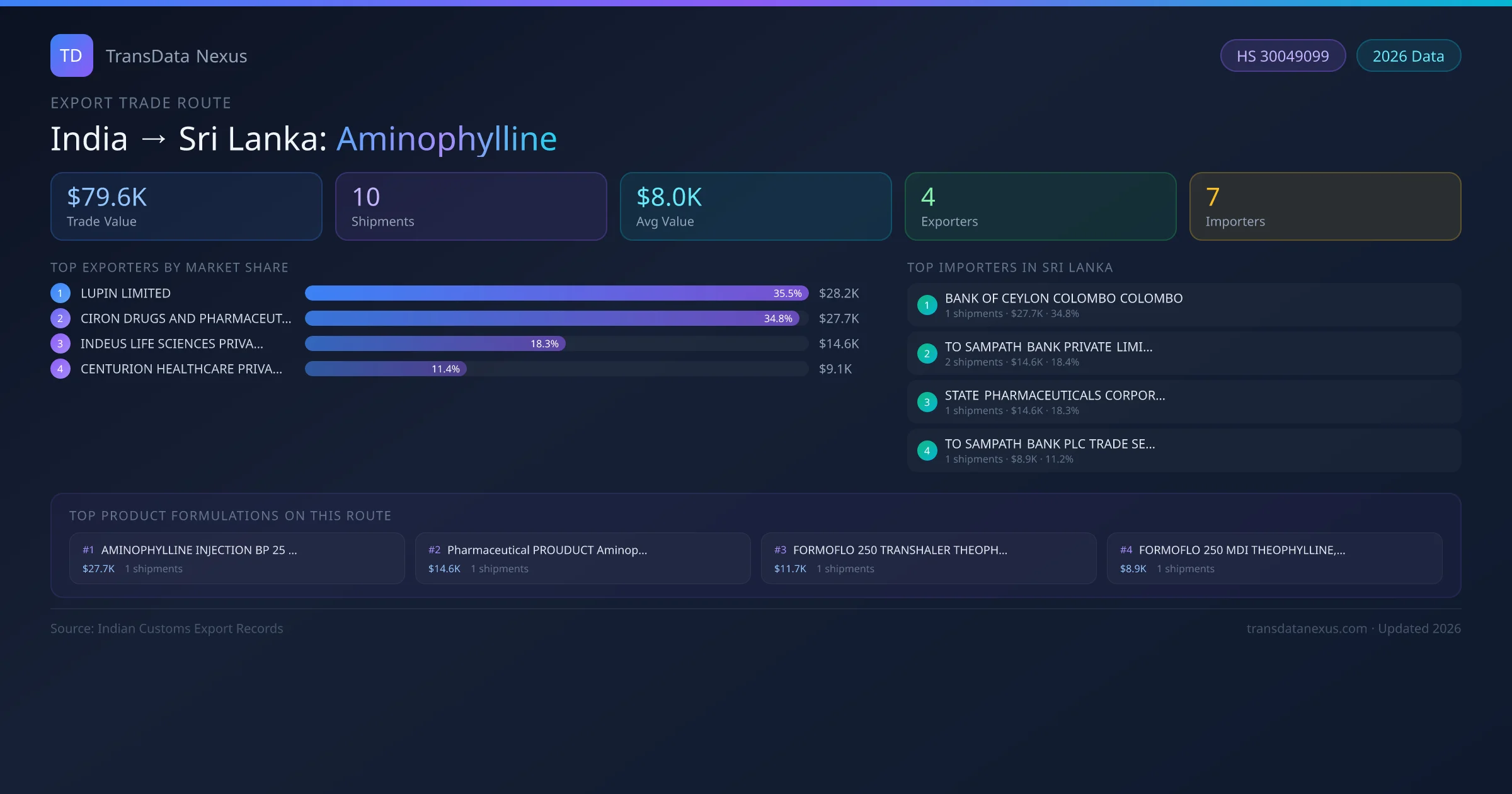 India has recorded 10 verified shipments of Aminophylline exported to Sri Lanka, representing a combined trade value of $79.6K USD. This corridor is served by 4 active Indian exporters, with an average shipment value of $8.0K USD. The leading Indian exporter is LUPIN LIMITED, which accounts for 35% of total export value with 5 shipments worth $28.2K USD. On the buying side, BANK OF CEYLON COLOMBO COLOMBO is the largest importer in Sri Lanka with $27.7K USD in purchases. The top 3 suppliers — LUPIN LIMITED, CIRON DRUGS AND PHARMACEUTICALS PVT LTD, INDEUS LIFE SCIENCES PRIVATE LIMITED — together control of total trade value on this route. All data sourced from Indian Customs (DGFT) shipping bill records. Values reported in FOB USD.