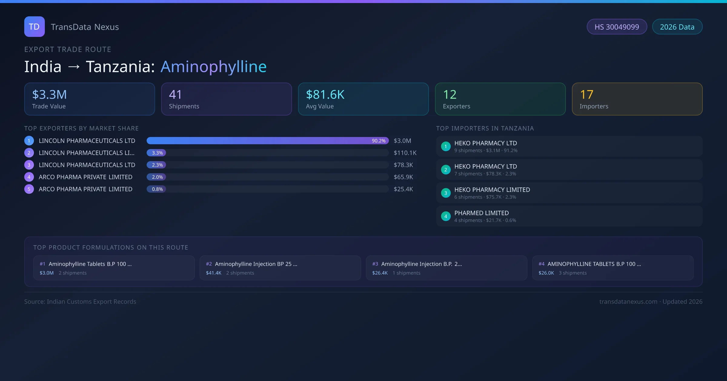 As of March 2026, the India-Tanzania pharmaceutical trade corridor remains active, with finished pharmaceutical formulations containing Aminophylline being a significant component. In 2025, this route accounted for 56.9% of India's total Aminophylline formulation exports, amounting to $3.3 million USD across 41 shipments from 12 Indian manufacturers.