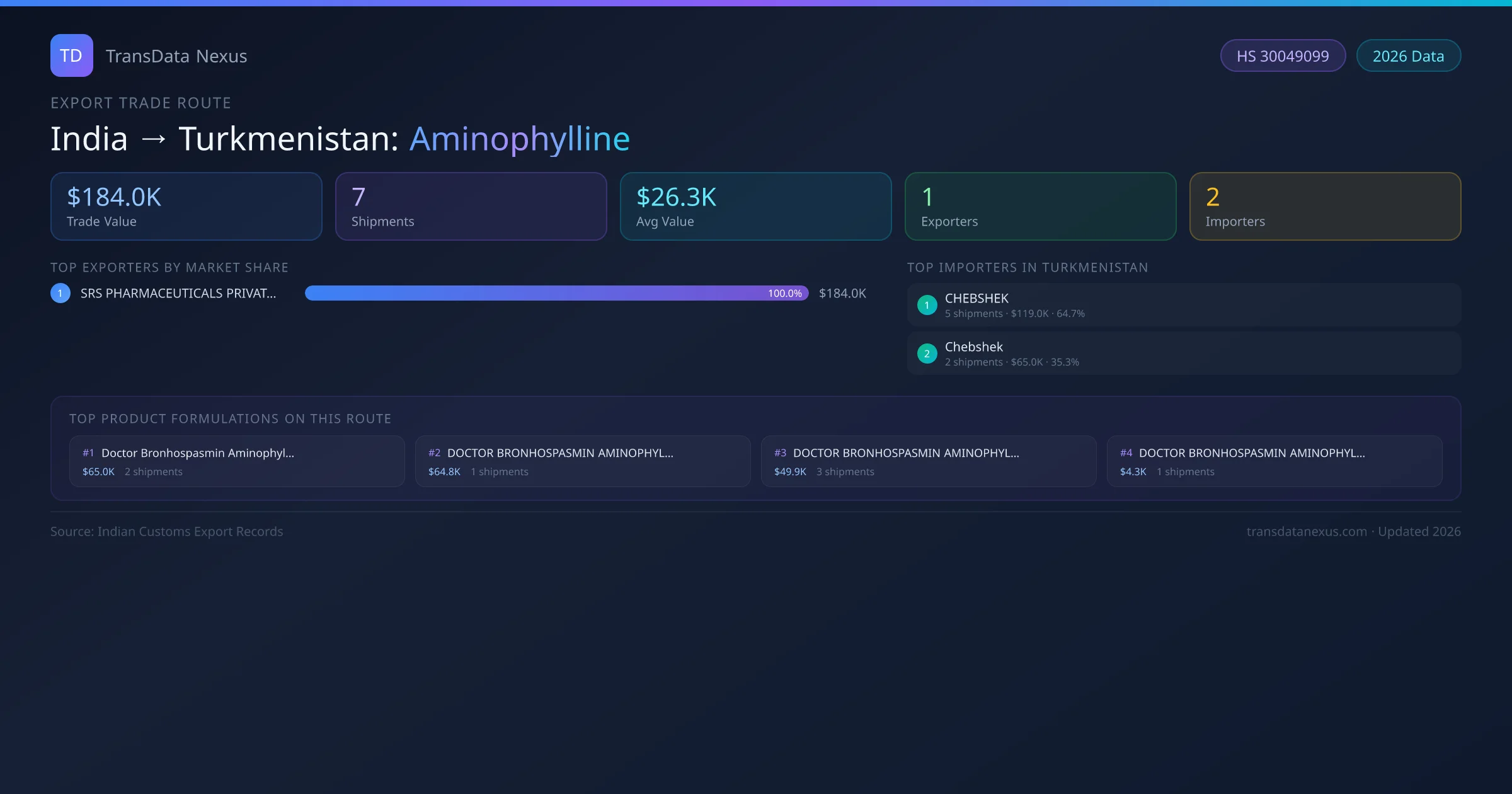 The India to Turkmenistan Aminophylline corridor is one of India's established pharmaceutical export routes, with 7 shipments documented worth a combined $184.0K USD. The route is dominated by SRS PHARMACEUTICALS PRIVATE LIMITED, which alone accounts for roughly 100% of all export value, reflecting the consolidated nature of India's aminophylline manufacturing sector.