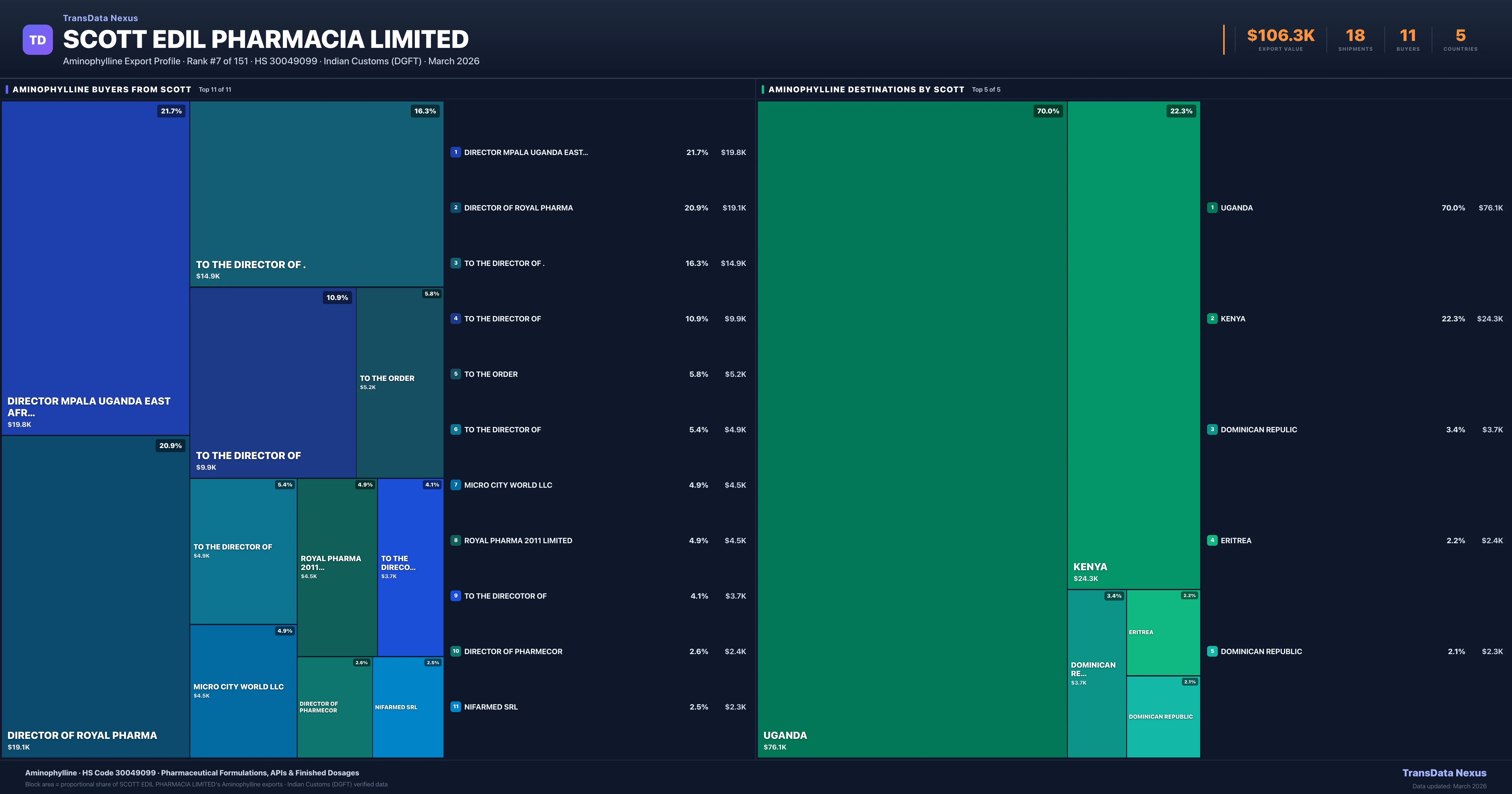 Scott Edil Pharmacia Limited supplies Aminophylline to 11 buyers globally. The largest buyer is DIRECTOR MPALA UGANDA EAST AFRICA (KENYA), followed by DIRECTOR OF ROYAL PHARMA (UGANDA) and TO THE DIRECTOR OF . (UGANDA). These buyers represent pharmaceutical distributors, hospital groups, and government procurement agencies in their respective markets.