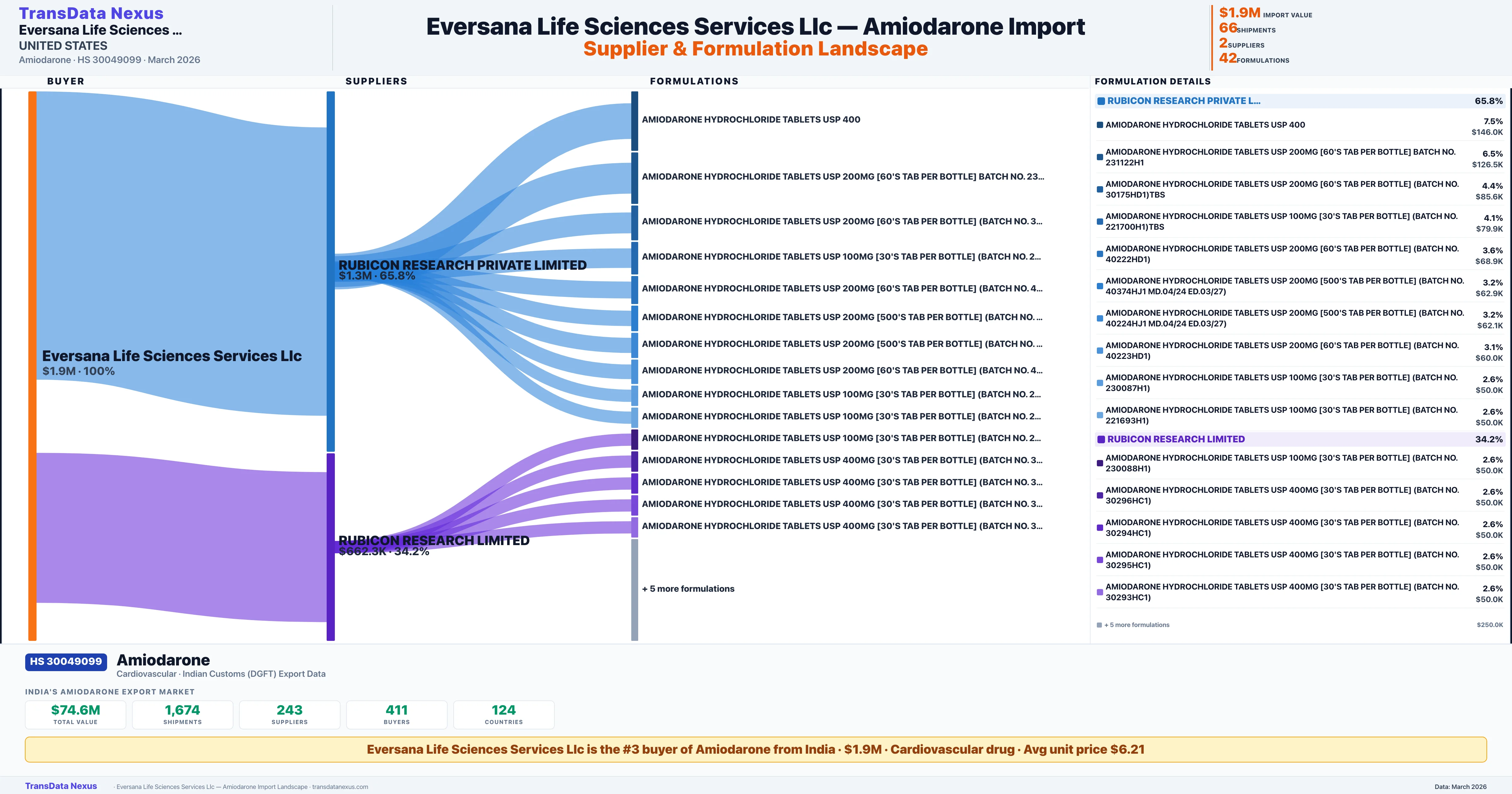 EVERSANA LIFE SCIENCES SERVICES LLC sources Amiodarone from 2 verified Indian suppliers: RUBICON RESEARCH PRIVATE LIMITED ($1.3M, 65.8%), RUBICON RESEARCH LIMITED ($662.3K, 34.2%). This is based on 66 customs records.