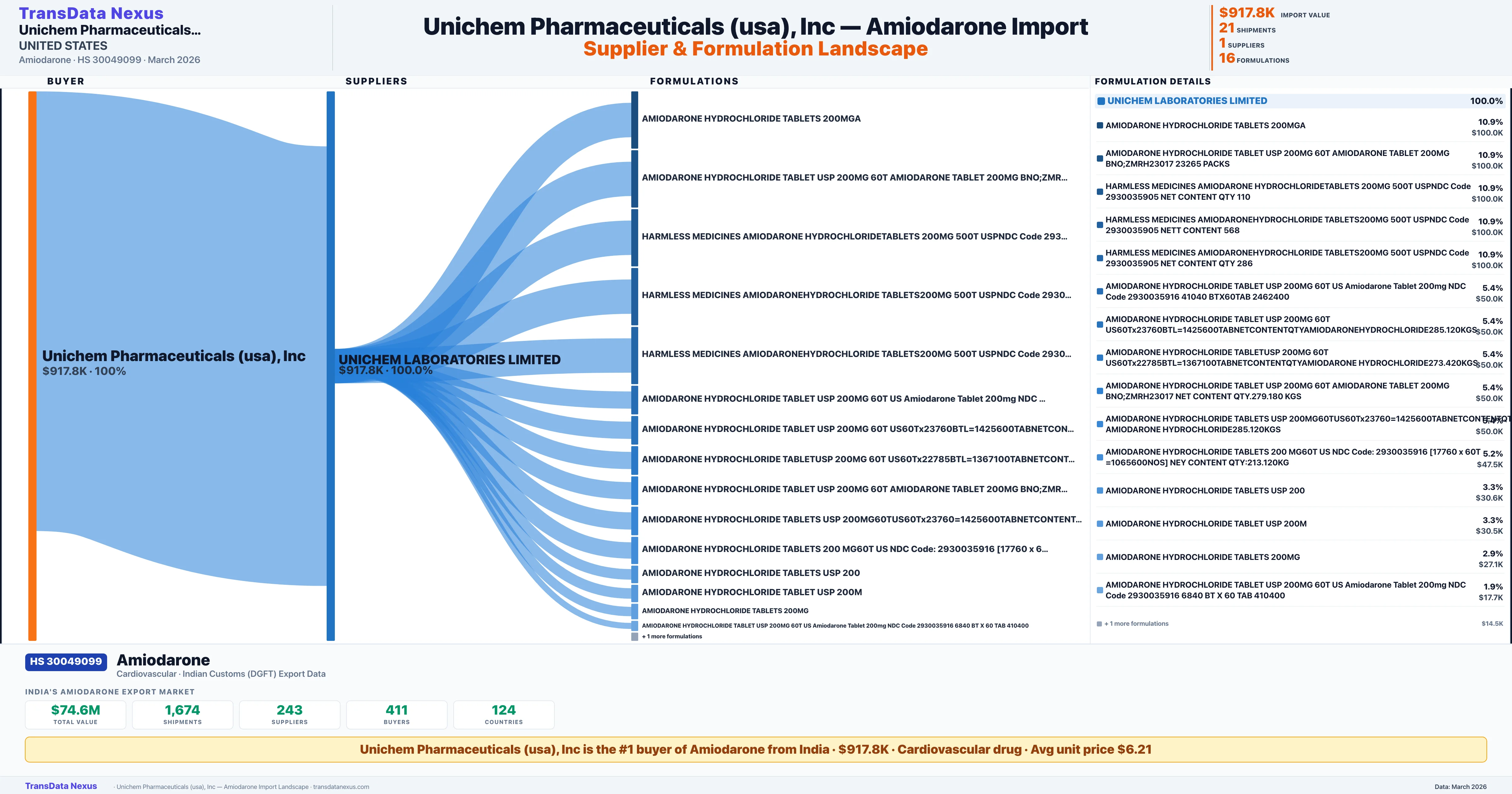 UNICHEM PHARMACEUTICALS (USA) INC. sources Amiodarone from 1 verified Indian supplier: UNICHEM LABORATORIES LIMITED ($917.8K, 100.0%). This is based on 21 customs records.