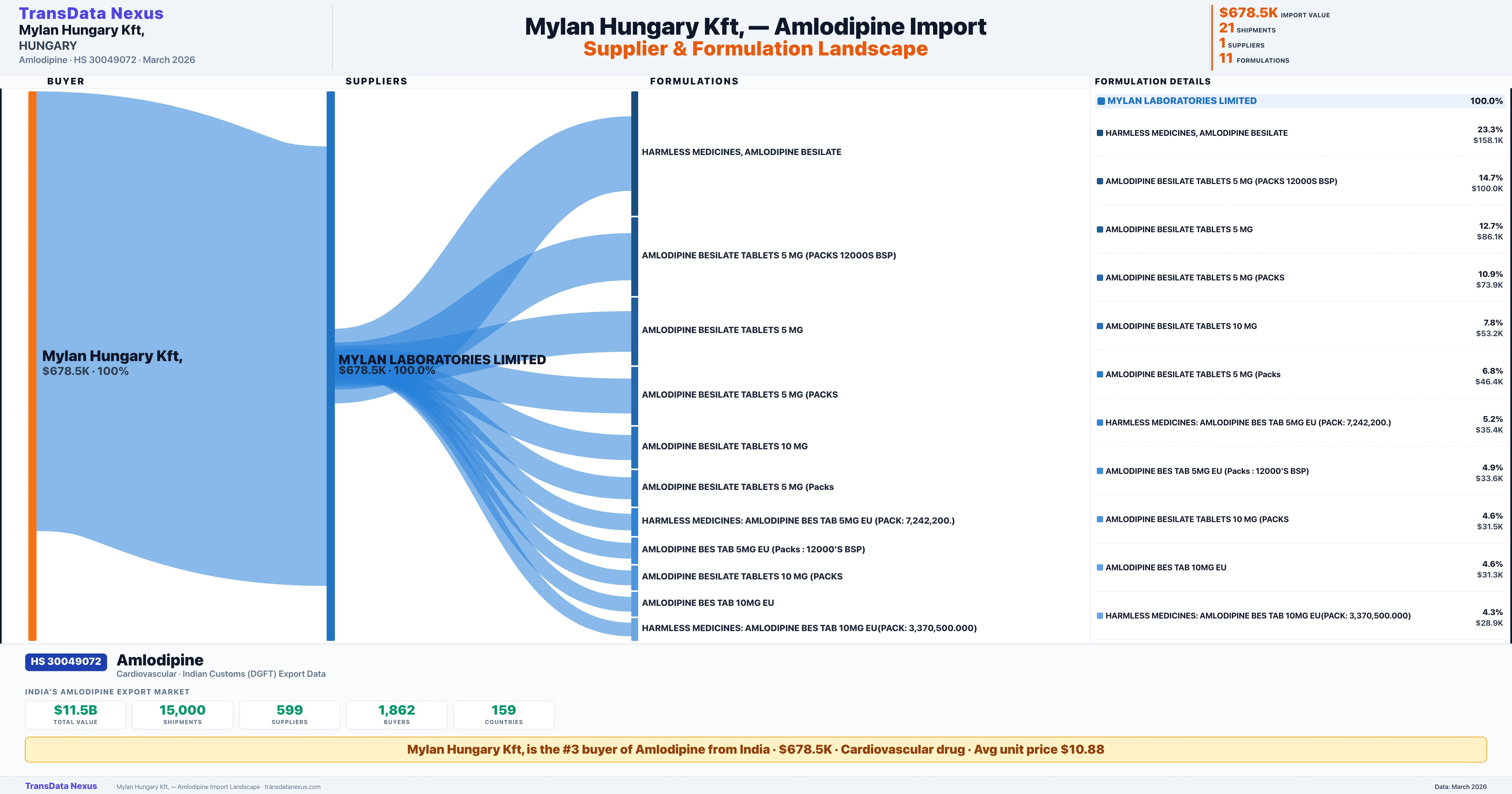 Access order-level details, pricing data, supplier connections, and competitive analysis for MYLAN HUNGARY KFT,'s Amlodipine imports. TransData Nexus provides verified Indian Customs (DGFT) data trusted by pharmaceutical trade professionals worldwide.