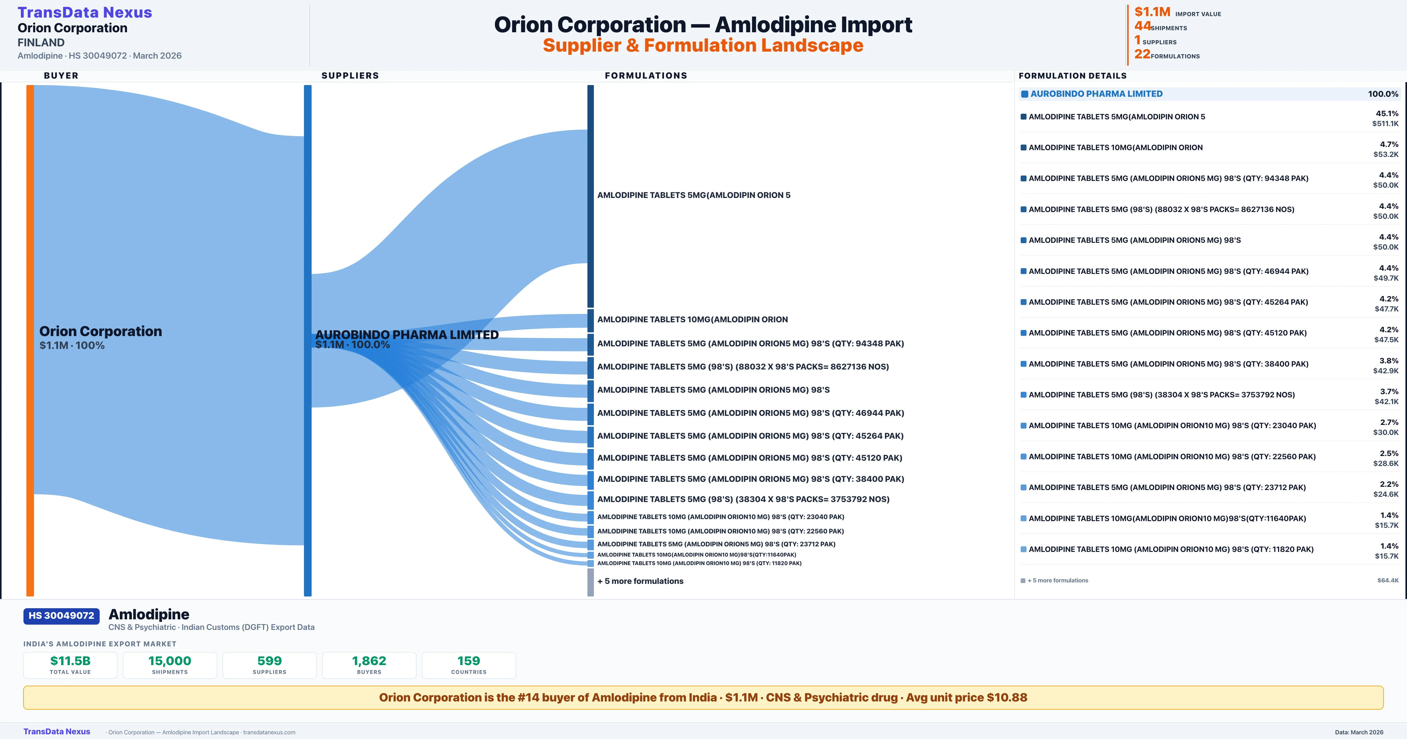 ORION CORPORATION, sources Amlodipine from 1 verified Indian supplier: AUROBINDO PHARMA LIMITED ($1.1M, 100.0%). This is based on 44 customs records.