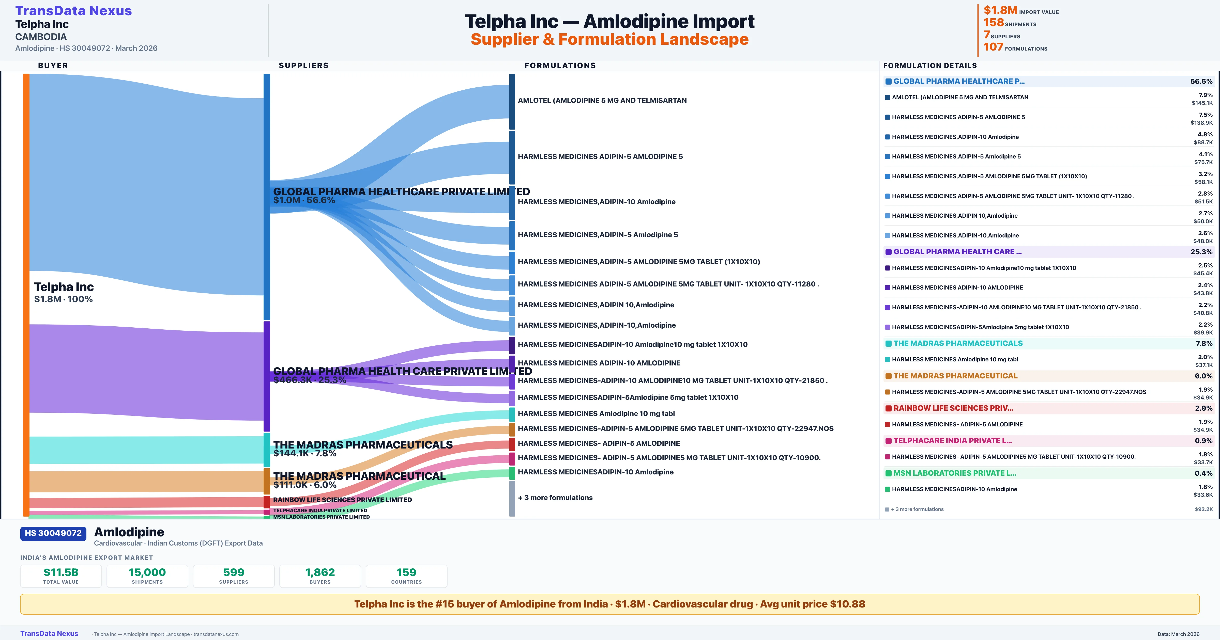 TELPHA INC sources Amlodipine from 7 verified Indian suppliers: GLOBAL PHARMA HEALTHCARE PRIVATE LIMITED ($1.0M, 56.6%), GLOBAL PHARMA HEALTH CARE PRIVATE LIMITED ($466.3K, 25.3%), THE MADRAS PHARMACEUTICALS ($144.1K, 7.8%), THE MADRAS PHARMACEUTICAL ($111.0K, 6.0%), RAINBOW LIFE SCIENCES PRIVATE LIMITED ($53.3K, 2.9%). This is based on 158 customs records.
