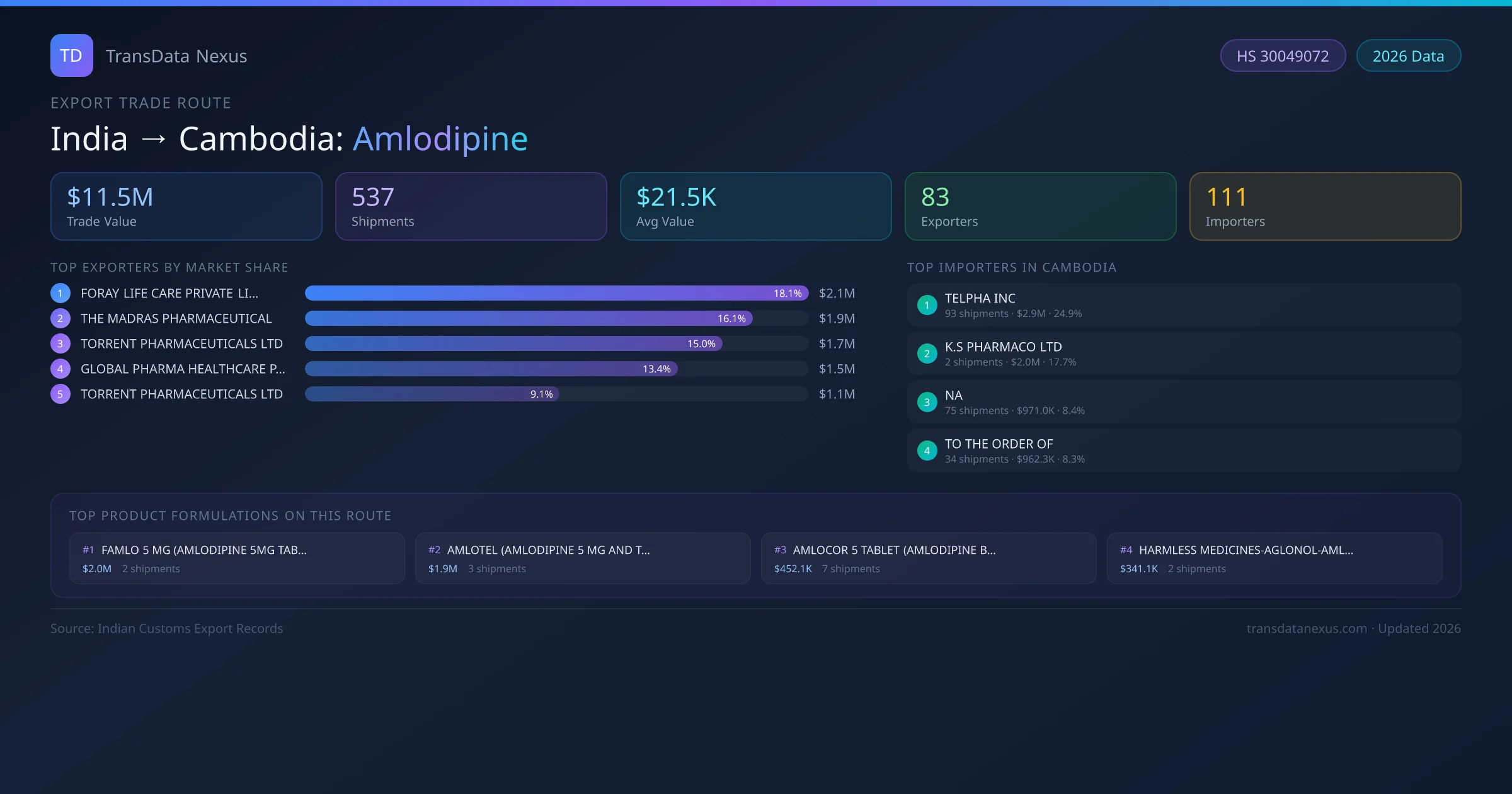 - 1.Route Identification: India to Cambodia export trade corridor identified from Indian Customs (DGFT) records for Amlodipine.