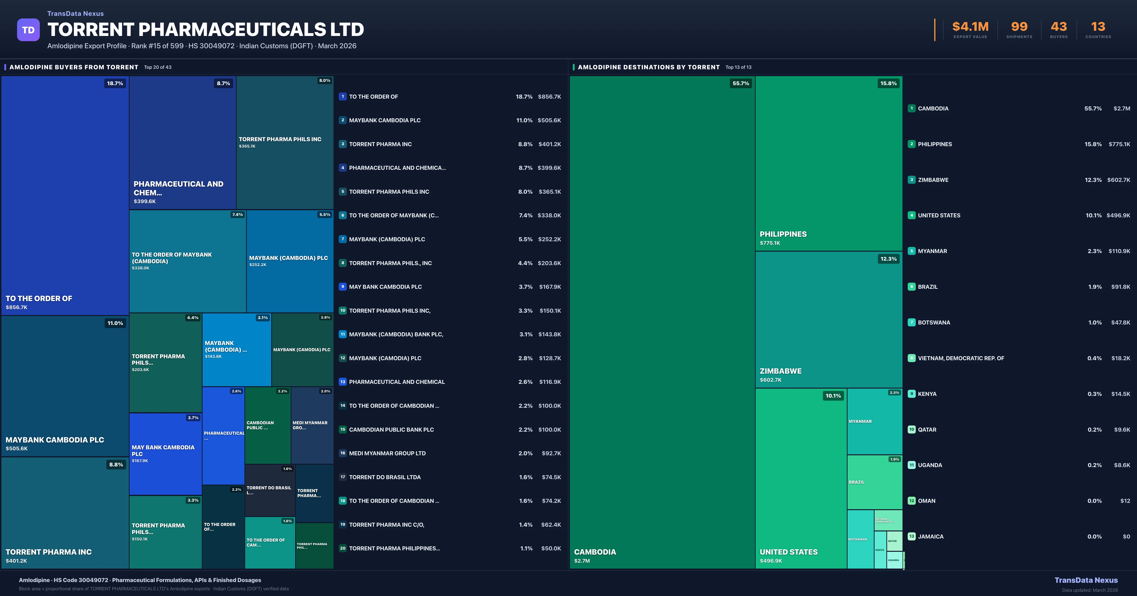 Torrent Pharmaceuticals Ltd supplies Amlodipine to 43 buyers globally. The largest buyer is TO THE ORDER OF (CAMBODIA), followed by MAYBANK CAMBODIA PLC (CAMBODIA) and TORRENT PHARMA INC (UNITED STATES). These buyers represent pharmaceutical distributors, hospital groups, and government procurement agencies in their respective markets.